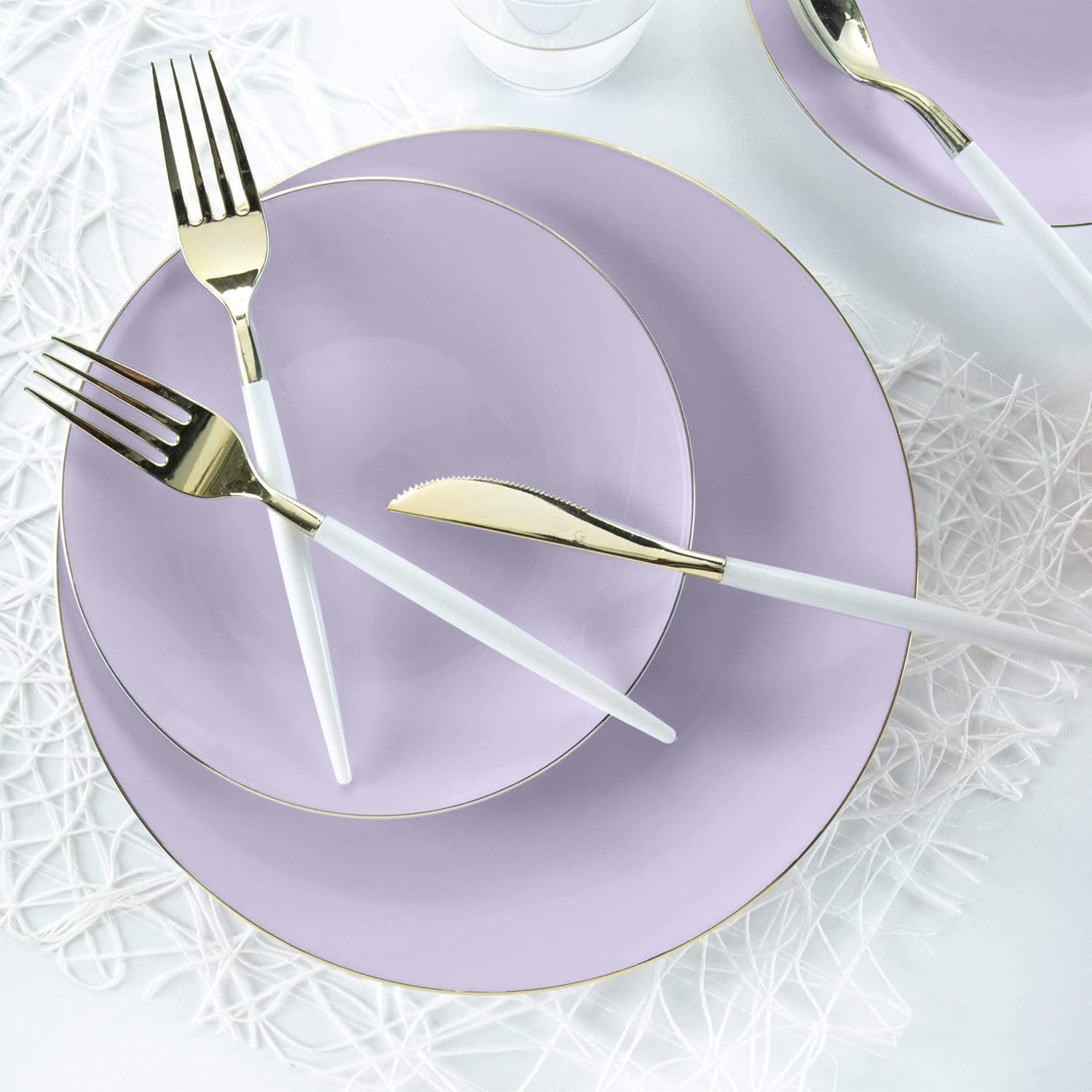 • PERFECT SETS FOR 30 GUESTS: These heavy duty lavender and gold plastic dinner plate sets are suitable for 30 guests. It comes with 30 pieces of 10.25-inch round reusable plastic dinner or buffet plates. These lavender plastic plates can boost your style and add to your elegance whether you're at a wedding or a party.