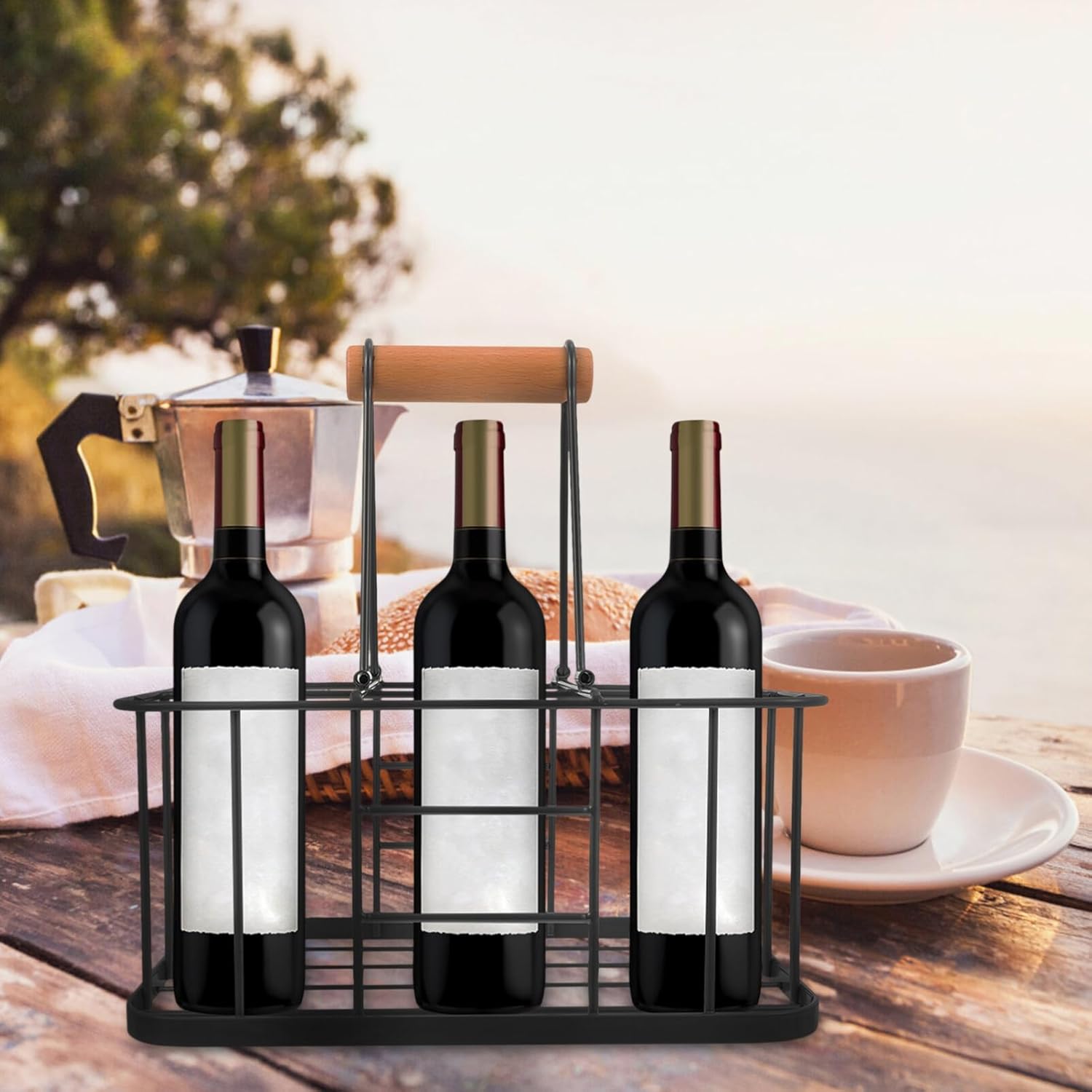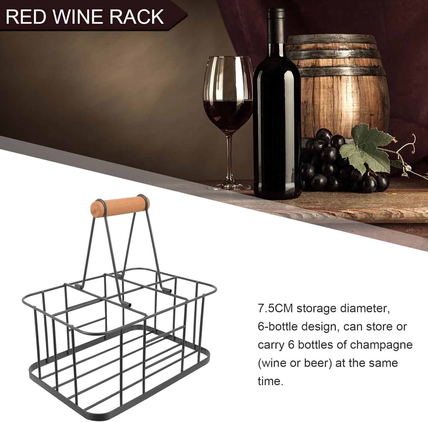 DescriptionMetal Wine Bottle Carrier Wine Carrier with Wood Handle Farmhouse Wine Rack Basket Decorative Wine Display Stand for Wedding Bar BBQ Picnic Red White Wine Milk Storage.FeaturesMaterial: Carbon steel and wood.Size: 29.20X21.00X29.20cm;11.48X8.25X11.48in;Package Including1 x wine rack