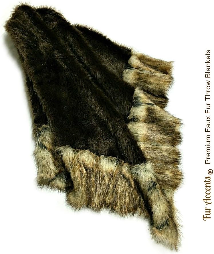 One Plush Luxury Fur Throw Blanket - Brown Beaver - Bear Skin Center with Golden Coyote - Wolf Fur Border Trim - 100% Animal Friendly Faux Fur - Beauty Warmth and Style - Easy Care - Cold Wash Air Dry - Minky Cuddle Lining - Fur Accents Original Designer Throws and Rugs - USA