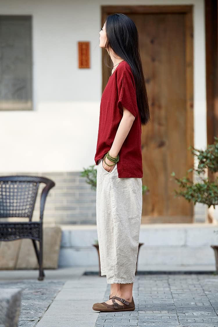 LUZU JUNU Womens Summer Cotton Linen Cropped Capri Trouser Casual Loose Wide Leg Baggy Pants