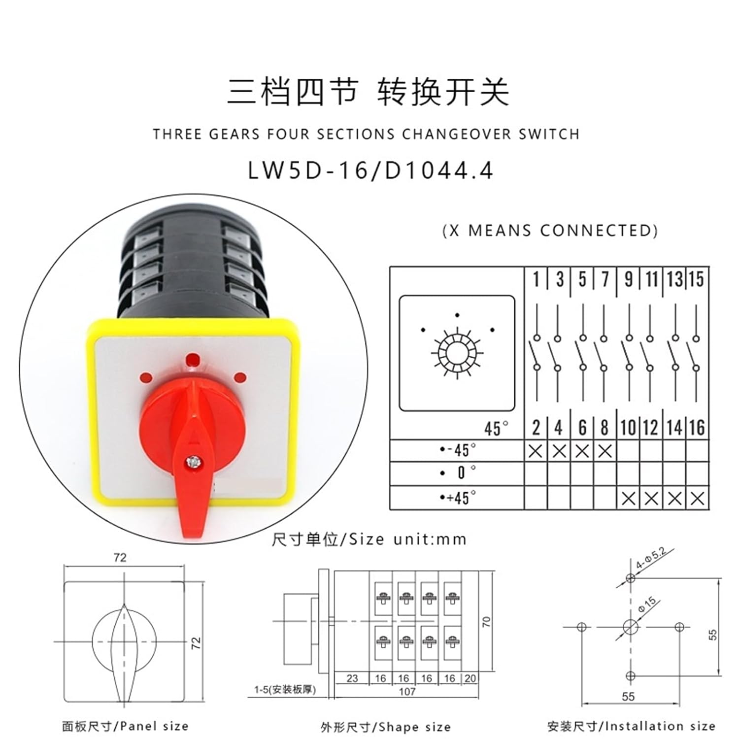 Knife Switches1.Product Name:LW5D-16/D1044.4 16A 4 Phase Universal Rotary Changeover Cam Switch2.Specification:Latching Selector ; Ui: 500V, Ith: 16A ; 4 Phase 16 Terminals3 Position 3.Rating :AC-15 : Ue AC500V/440V Ie 2ADC-13 : Ue DC220V Ie 0.14A Current : 16AMaterial : PlasticSwitch Type : Universal SwitchModel Number : LW5D-16/D1044.4Features : 4 PhaseItem Type : SWITCHES Rated insulation voltage(Ui) : 500VConventional heating current(Ith) : 16AUse category 1 : AC-15Rated working voltage(Ue)1 : AC500V/440VRated working current(Ie) 1 : 2AUse category 2 : DC-13Rated working voltage(Ue)2 : DC220VRated working current(Ie) 2 : 0.14A