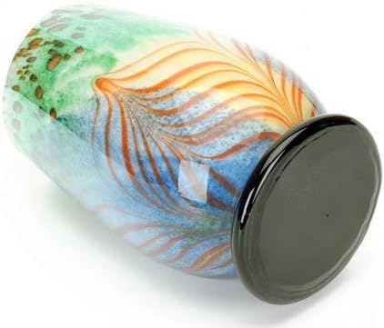 This lovely vase was handcrafted by skilled artisans who worked night and day to refine his skill. Each piece starts with a designated shape carefully formed by the artist. Through hard work and years of experience the artist creates various designs of vibrant colors and textures which engulf the surface each piece. Usually several layers of assorted colors and designs are rendered--overlapping one another. Once the piece nears the end of completion, it is finished with a clear coat of glass to give it an exquisite glimmering shine.