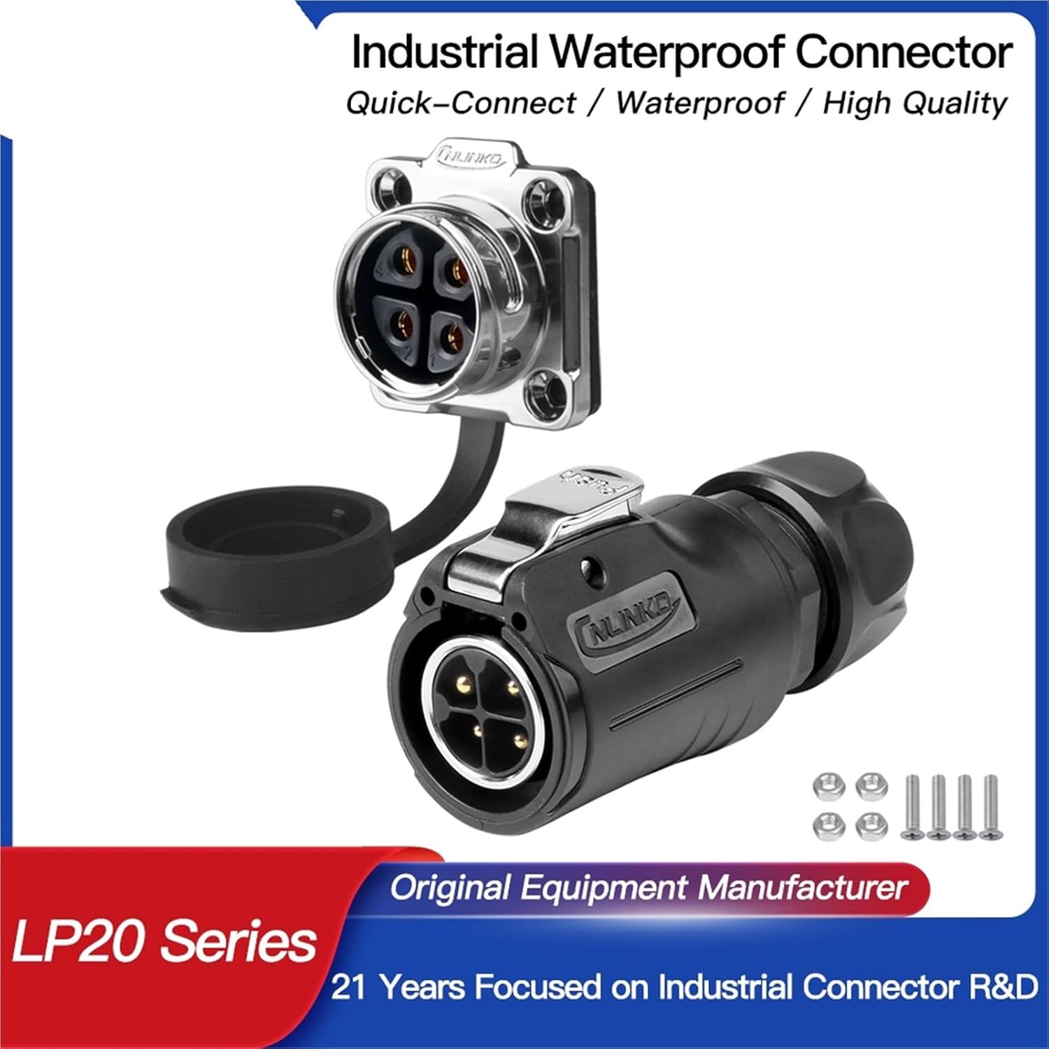 Connectors==========Model Number : LP20 Anti-retreat ConnectorCertification : CE,RoHS,UL,weeeConnector type : 1/4 bayonet connectingWaterproof Level : IP68Material : plastic and metalWorking temperature : -25 degrees Celsius~+85 degrees CelsiusAssembly style : SolderingType : ConnectorCurrent rated : 20AOperating voltage : 500V ACLife cycle(Min.) : 500 timesShell&insulated parts : PBTHardware metal : Zinc AlloyContact pin : Brass with gold-platedSealing : Silicone / rubberPins : 4 Pin