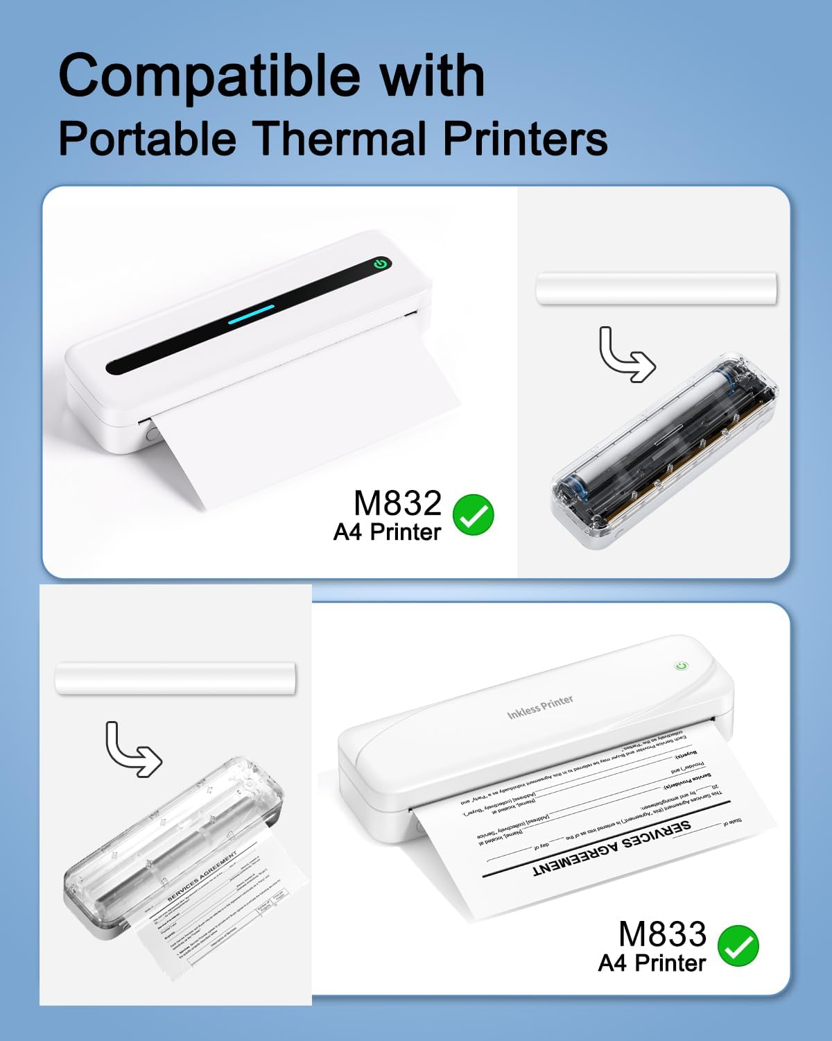 M833 Inkless Portable Printer for Travel, White Bluttooth Wireless Thermal Printer with 4 Roll US Letter Thermal Paper