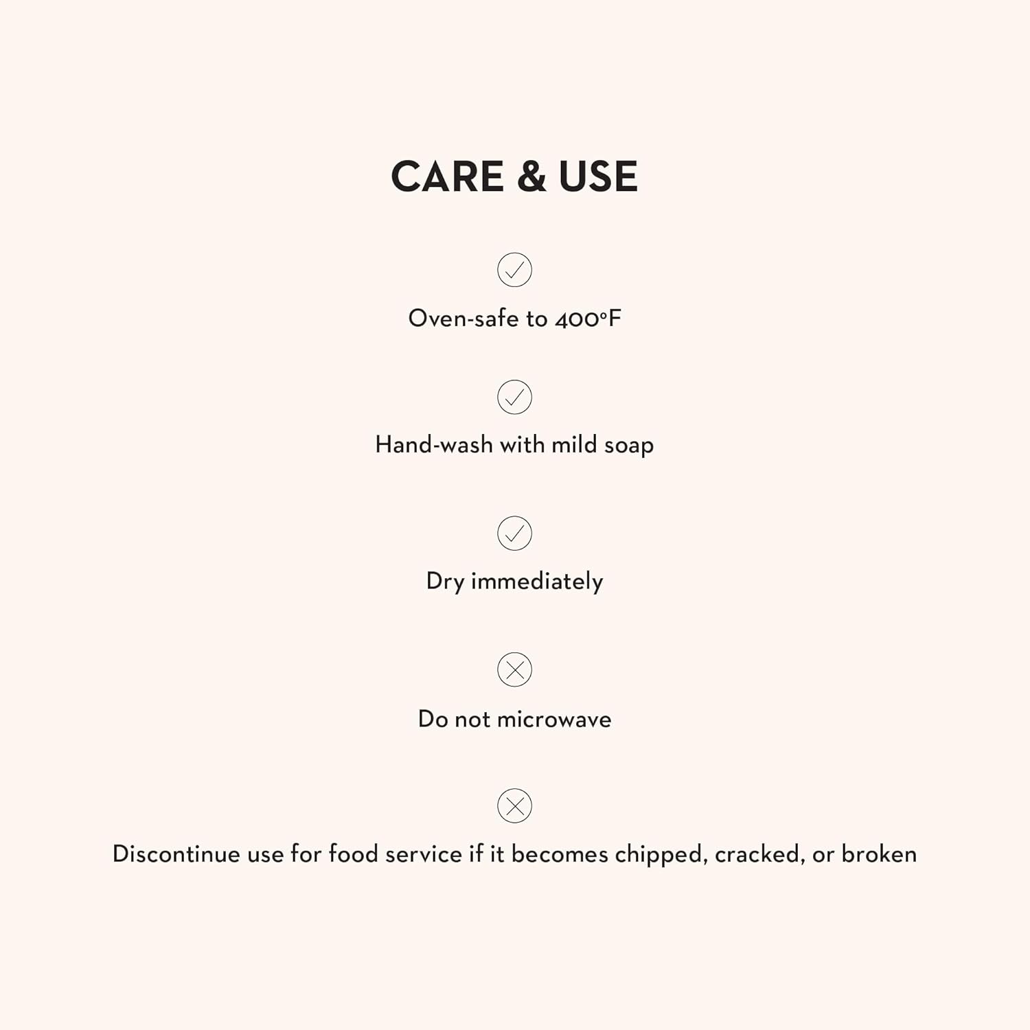 | Product Care Instructions | Oven-safe to 400 degrees Fahrenheit. Dishwasher safe; For best results, hand-wash with mild soap and dry immediately. Do not microwave. Our enamelware exceeds both federal food safety regulations and California's Proposition 65, the strictest environmental safety standards in the U.S. Handle enamelware with care and discontinue use for food service if it becomes chipped, cracked, or broken. |