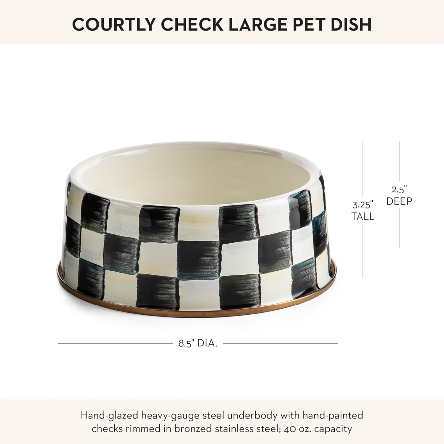 | Material | Heavy-gauge, hand-glazed steel underbody with hand-painted Courtly Checks, rimmed in bronzed stainless steel. Pieces may vary due to the handmade nature of each product. Imported. |