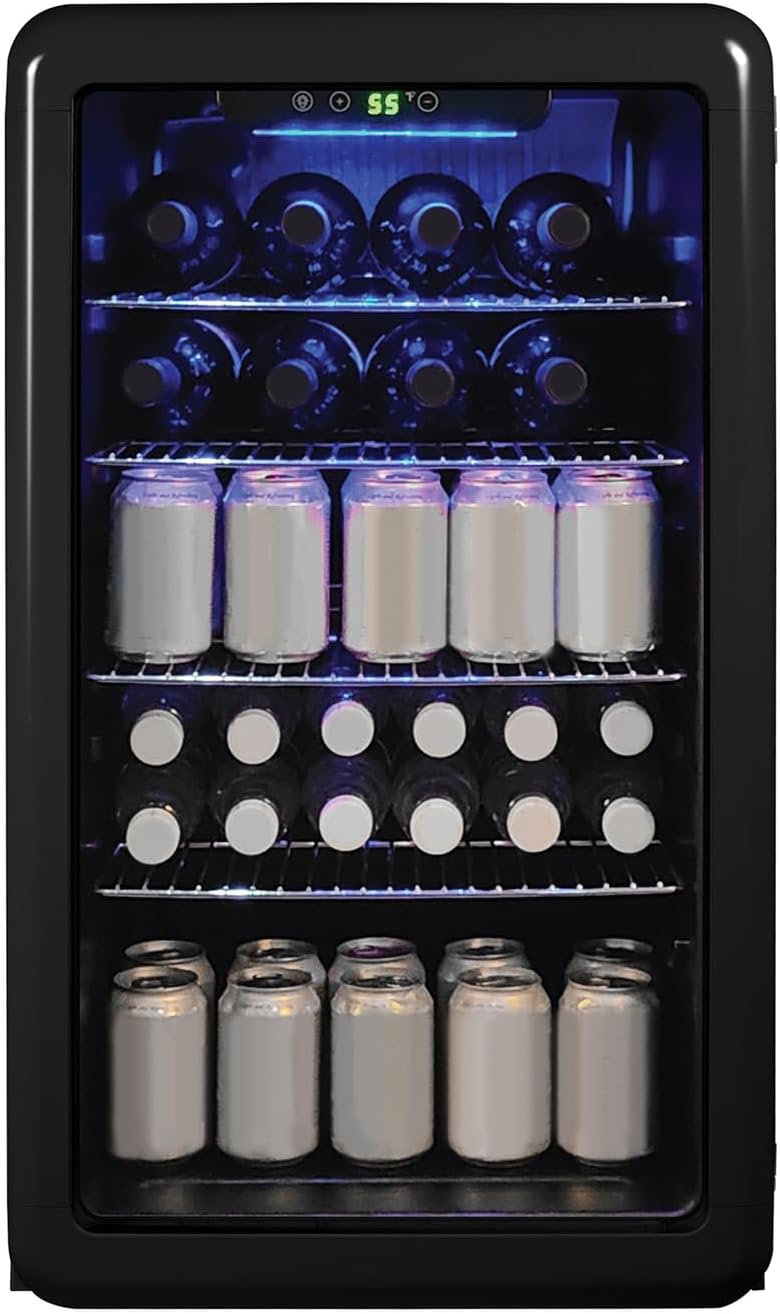 The Magic Chef 3.4-Cu. Ft. Retro Beverage Cooler in Black will be the ideal addition to any dorm, office, or rec room. The stylish nostalgic look will complement any decor. The LED blue lighting showcases your beverages while the tinted double-pane glass door is more energy efficient than single-pane glass and helps prevent condensation. There are 4 removable wire shelves which can be adjusted according to your beverages. This beverage cooler offers a 1-year parts-and-labor warranty and 5-year compressor-part warranty.