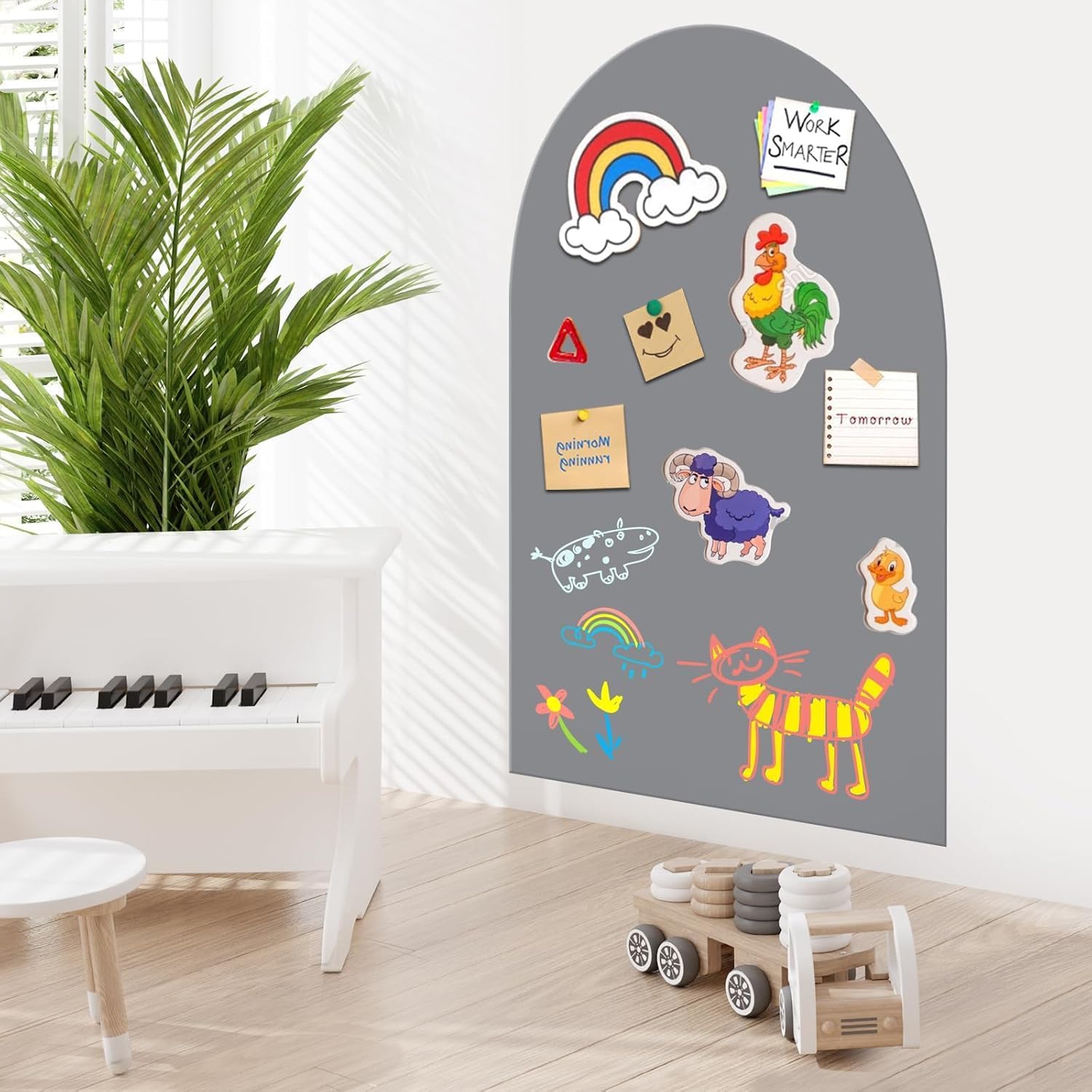 Magnetic Wall Decal in Arch Shape, tailored for bringing a touch of warmth and creativity to your child's room.This Magnetic wall sticker combines elegance with practicality, designed specifically for smooth wall surfaces and perfect for use in children's rooms for endless hours of imaginative play and artistic expression. Crafted with a self-adhesive back, our magnetic wall decal is incredibly easy to apply, ensuring a seamless integration into your child's room decor. The soft, inviting hue of Light Gray creates a cozy and nurturing atmosphere, making it an ideal backdrop for a child's creativity to flourish. The unique magnetic surface allows your little ones to easily attach and rearrange their favorite magnetic toys, drawings, or other lightweight decorative items, fostering their creativity and fine motor skills. Whether your child is a budding artist ready to unleash their inner Picasso or simply enjoys organizing their treasures, this wall decal offers endless possibilities for play and learning. Perfect for use in children's rooms for wall decoration, as a canvas for doodling and scribbling, or as a focal point to anchor the room's theme, our Light Gray-Colored Magnetic Wall Decal in Arch Shape is durable, easy to clean, and designed with safety in mind. It adds a touch of magic to your child's space, making everyday moments more fun and colorful. Bring a smile to your child's face and watch their imagination take flight with our versatile and charming magnetic wall decal – where creativity meets convenience, and everyday play becomes extraordinary.