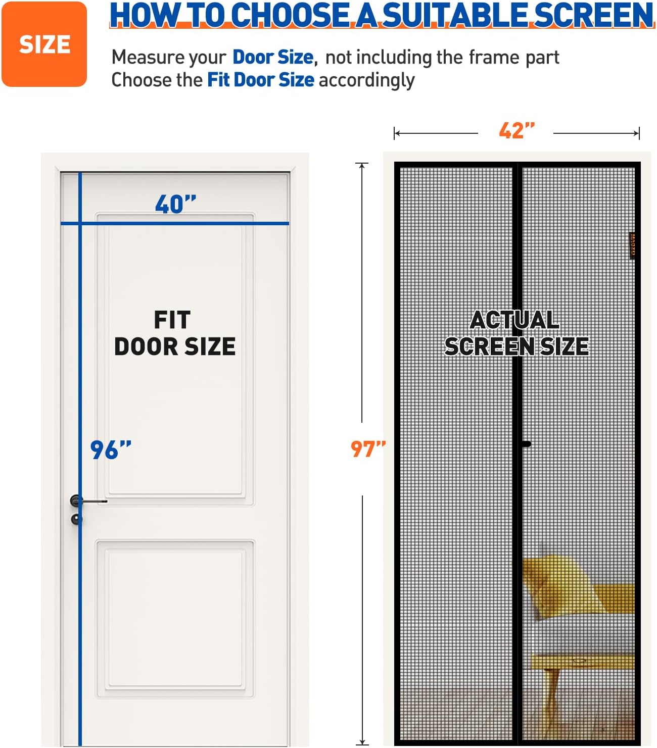 • SCREEN DOOR SIZE: MAGZO screen door mesh is 42" x 97" which fits door size 40" x 96" excluding the door frame part. Please measure carefully your door size before choosing