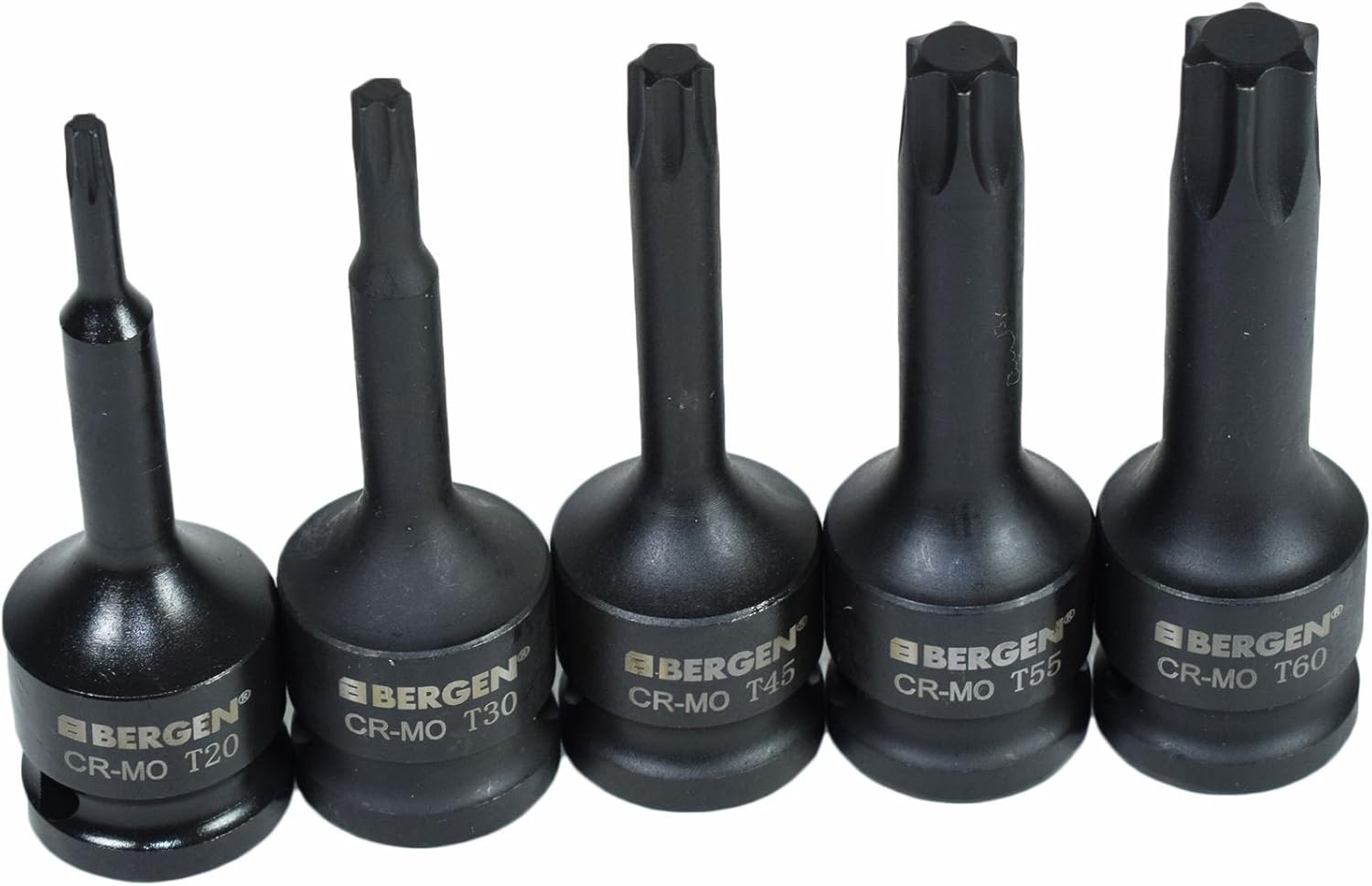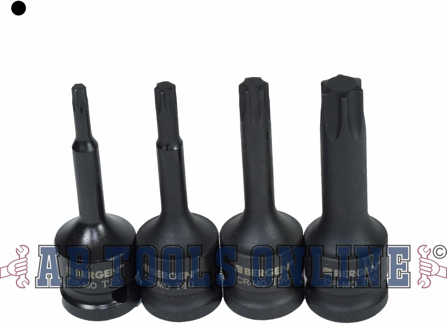 Professional tool for commercial or occasional use Torx / star male bit sockets Impact torx for added strength and durability Manufactured from chrome molybdenum steel for strength and durability Impacted torx bits so perfect for use on impact guns or high torque tools 1/2" drive so will fit any 1/2" drive ratchet / impact gun / breaker bar / power bar etc. Total length 78mmSET INCLUDES THE FOLLOWING - T20 / T25 / T30 / T40 / T45 / T50 / T55 / T60 and T70 Comes in a blow molded case for easy storage and transportation