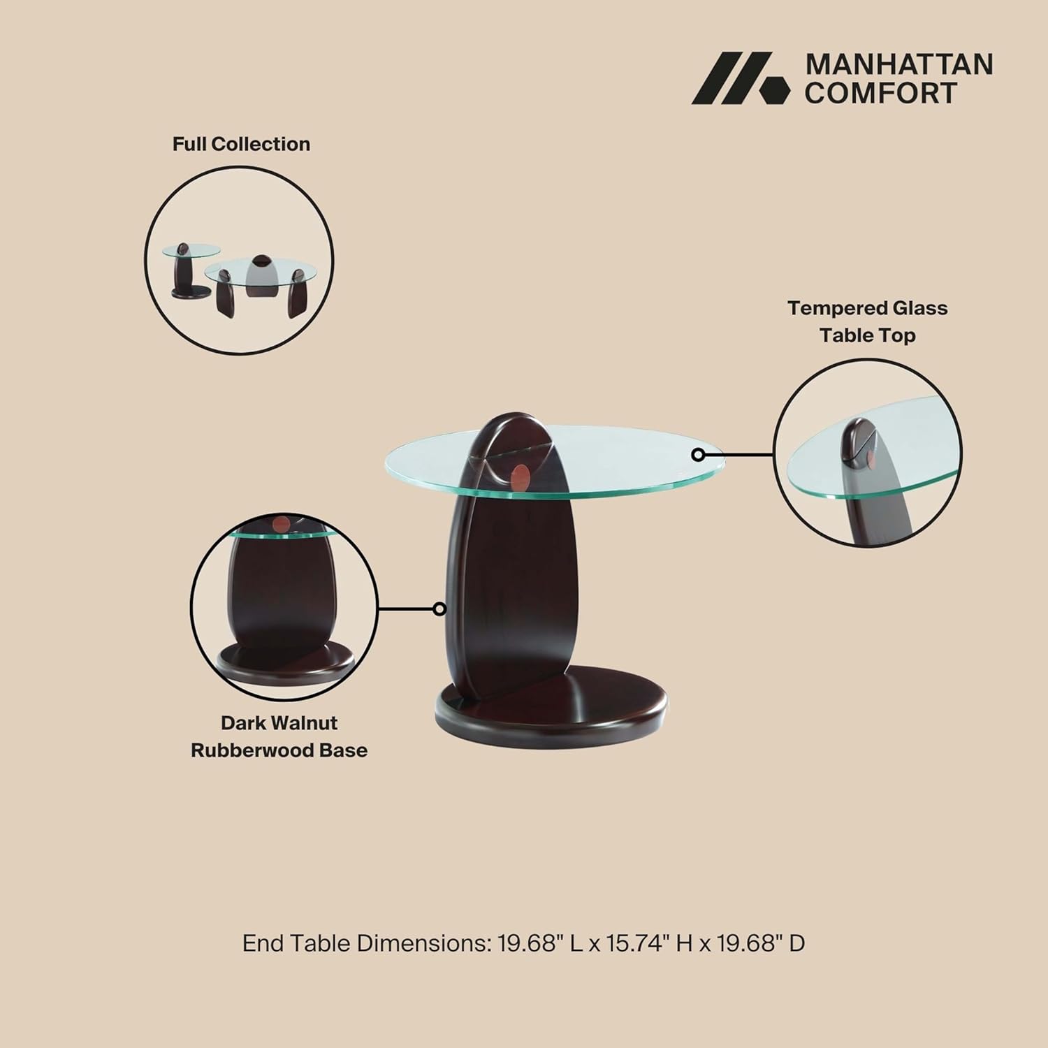 Experience the epitome of contemporary sophistication with the Manhattan Comfort Artesia Collection, featuring a stunning glass top coffee table, a chic end table, and a versatile 2-piece set. Each piece boasts a sleek tempered glass top and a dark walnut solid wood base, blending style and functionality seamlessly. This tempered glass coffee table is designed to elevate your decor, offering ample surface space for essentials. The unique coffee table serves as a striking center table for living rooms, while the end table doubles as a stylish living room side table. Perfect for apartment furniture, this glass living room table provides a modern touch to any home. The 2-piece set features a round nesting coffee table design, allowing the end table to slide above the coffee table, creating a captivating layered effect. Whether you're looking for a center table, a living room side table, or nesting tables for living room arrangements, the Artesia Collection delivers unparalleled elegance and versatility. Minimal assembly required; all hardware included.