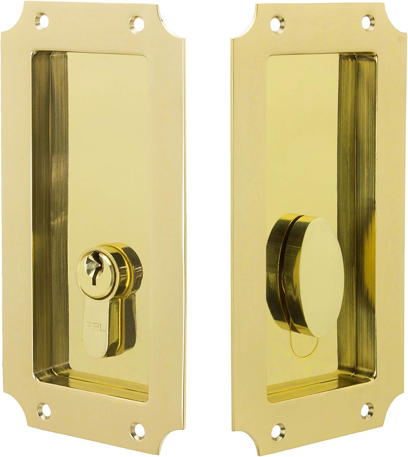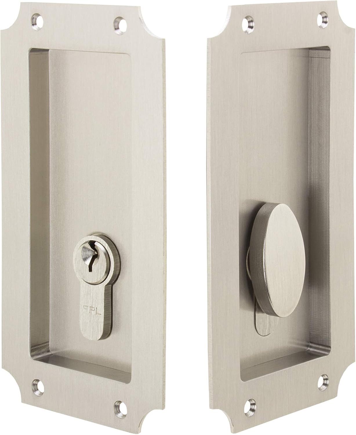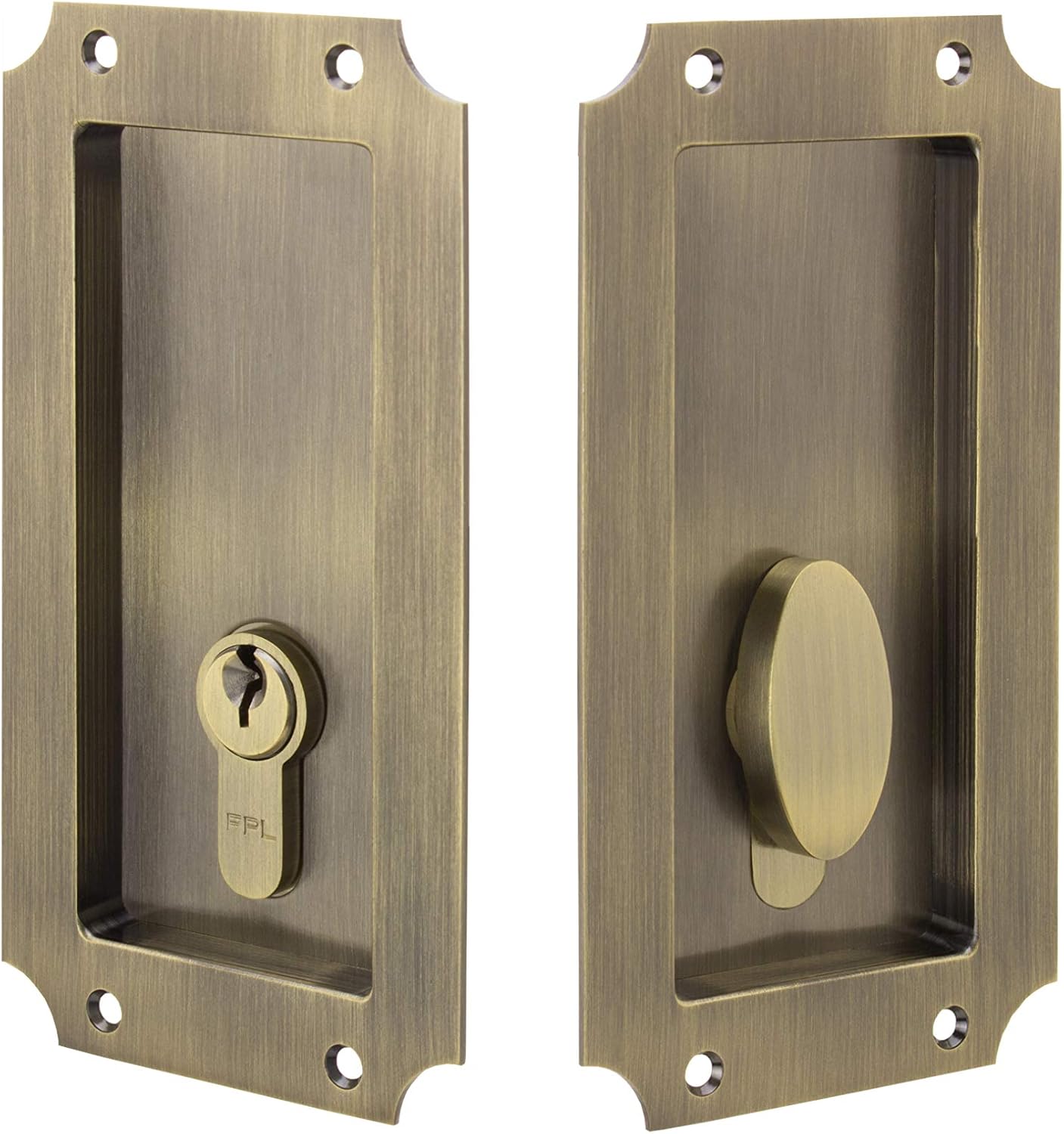 Manor Solid Brass Pocket Door Lock - Single Keyed Euro Profile Cylinder: This appealing pocket door lock is an excellent choice to enhance your solid core pocket doors. Beautiful and durable finishes over solid brass and stainless steel construction ensure quality you can see and feel. The single keyed set comes complete with mortise lock and strike, European profile cylinder, two flush pulls, one edge pull, mounting hardware, and installation instructions. Please see photos for mortise lock, flush pull, and edge pull dimensions. Mortise lock is of solid brass and stainless steel construction. Profile cylinder, flush pulls, edge pull, and strike are of solid brass. Keyed double cylinder, privacy, and passage functions are also available but listed separately. For double pocket or sliding doors use a keyed or privacy set for one door and a passage set for the other door. Install the latch strike from the locking set on the edge of the opposite door, allowing the two doors to be locked together. Beautiful design and finish combined with durability and longevity makes the Manor Pocket Door Hardware the best choice for your pocket door.