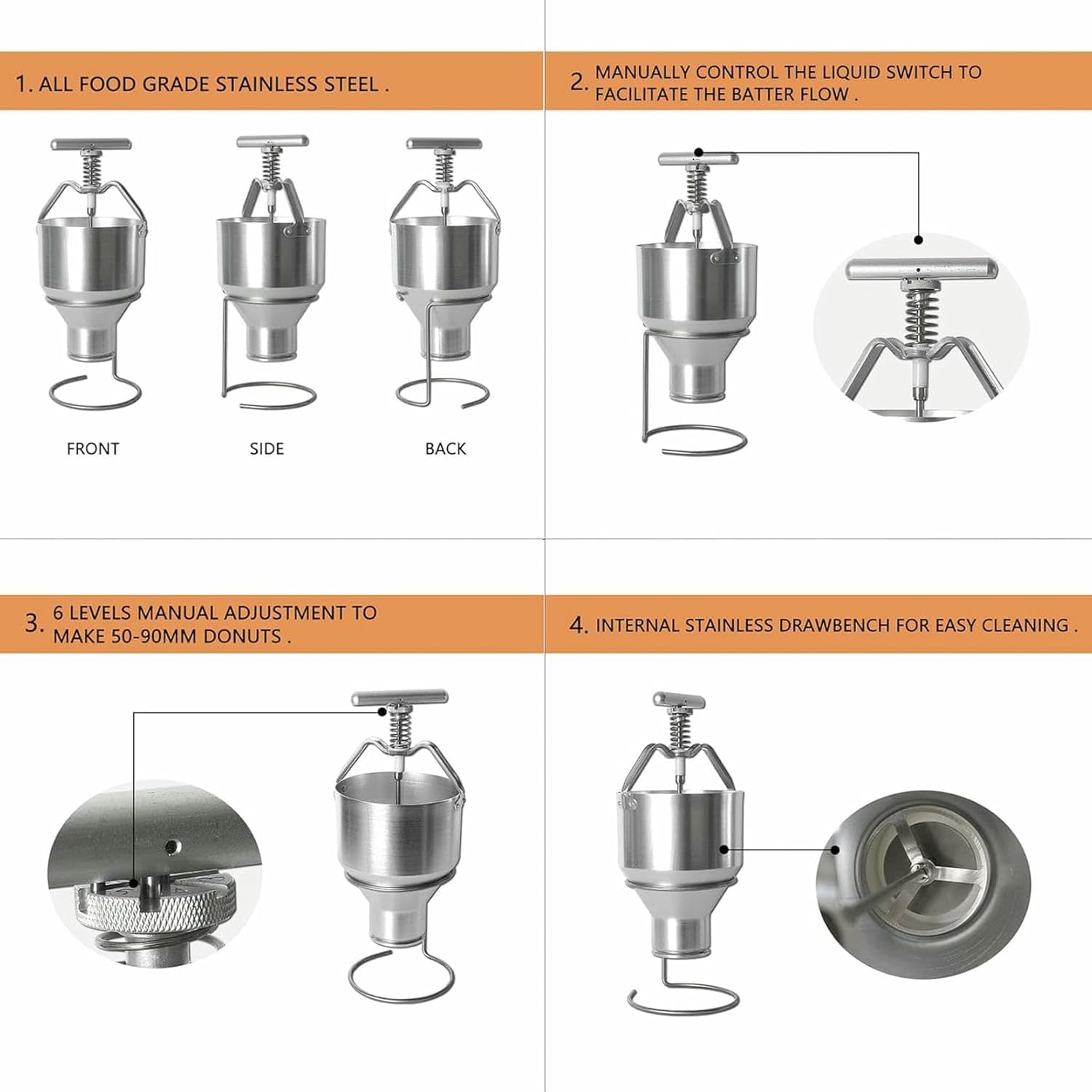 This manual donut dispenser is designed for you to make delicious donuts. It is ideal for perfectly shaped home-made donuts. The food-grade aluminum material ensures a sturdy structure and compact design. The integrated control bar allows the donut hopper to be operated with just 1 hand. It is suitable for both home and commercial use.Specification: Style:Donut Molding Machine Type:Manual (hand crank) Material:Stainless Steel body&Aluminum handle Capacity: 1.3 US gal (5L) Dimensions:180*180*420(mm) Plunger: 35-38mm with 6 adjustments Size of donut: 40-70mm bakeware: 180(mm)/7.08 inch Weight: 6.17 lbs Apply to:Commercial or home use,such as tea restaurants,cafeterias, bakeries, beverage shop etc.Features: a.Integrated operation hand shank, easy to operate b.High quality handle,portable and lightweight. c.With 6 control gears,the thickness of donuts can be decided at your will.Package Includes: 1 x Donut Depositor 1 x Stand Holder