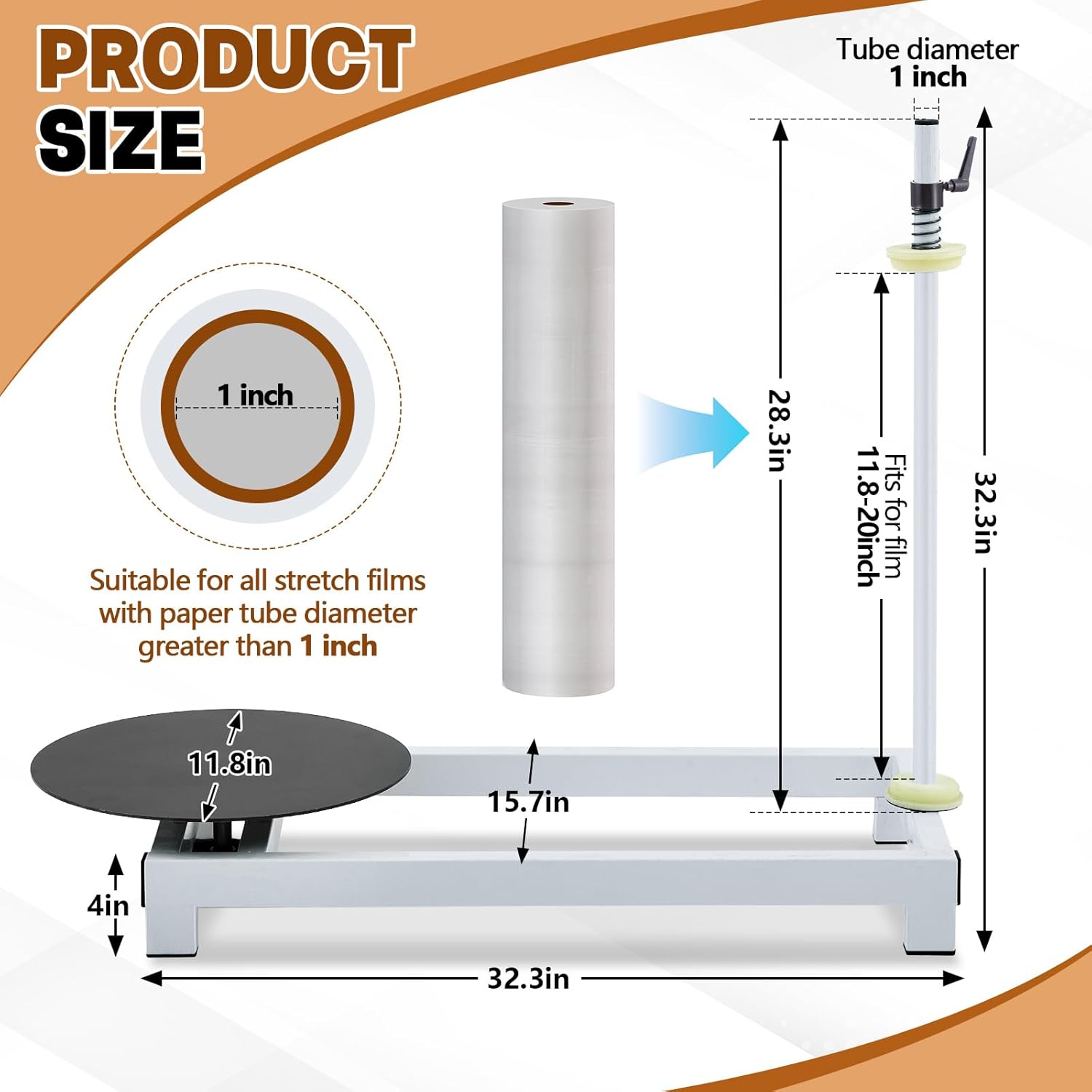 • Ideal Size: the film wrapping machine size of approximately 32.3×15.7×32.3 inches; It is expertly designed to accommodate a stretch films from 12 to 20 inches, with a paper tube diameter exceeding 1 inch; This adaptability makes it an efficient solution for various packaging tasks