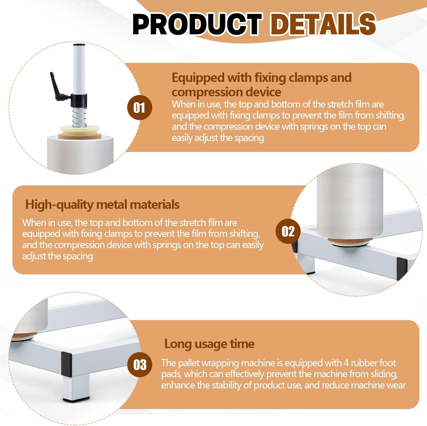 • Innovation Design: the heavy-duty stretch wrap machine is thoughtfully equipped with a fixing clip and spring mechanism, allowing easy adjustment of torque and secure fastening of the stretch film; Complemented by non-slip rubber pads on its base, this design enhances product stability during use, minimizes machine wear, and helps in reducing maintenance efforts, streamlining the packaging process