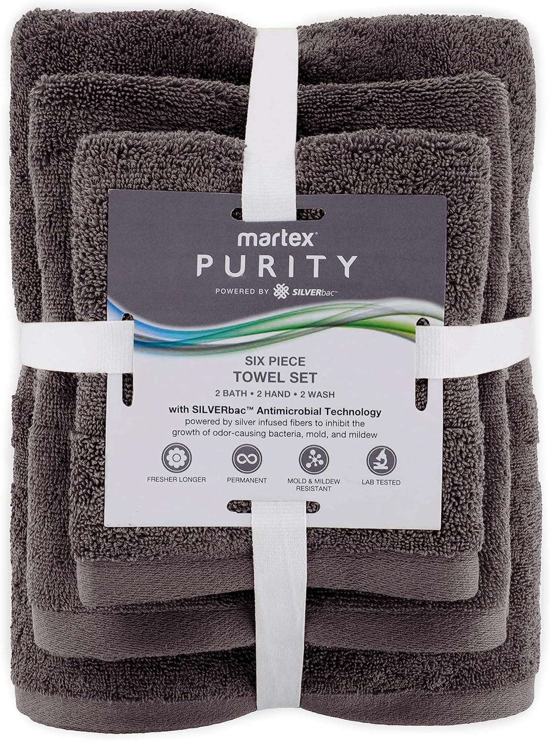It’s easy to freshen up your bathroom with the Martex Purity 6 Piece Towel Set. These towels feature SILVERbac technology that stay clean and fresher longer. SILVERbac technology uses silver-infused polyester threads with properties that will never wash out and will last the life of the product. Whether you use these towels after workouts at the gym, morning showers, or at the beach you can be sure they will stay soft, smell fresh and free of unpleasant odors. Available in a choice of neutral colors White, Taupe, Light Gray and Dark Gray and made with 97% Cotton and 3% Polyester. This set includes two bath towels, two hand towels and two wash cloths. Machine wash cold. Wash with similar colors. Only non-chlorine bleach when needed. Tumble dry low. Remove promptly.