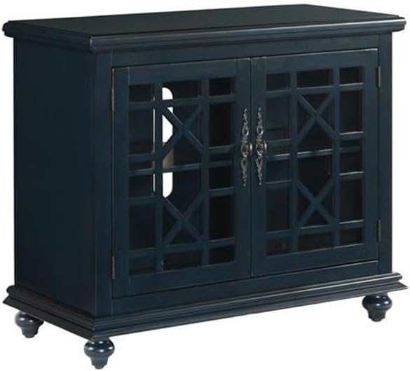 The Elegant Small Spaces collection is designed for with functionality in mind to be used as an occasional or accent cabinet in any room in the home or as a TV Stand. This piece features a beautiful Antique Black painted finish with sophisticated transitional styling inspired by design cues taken from Parisian antique markets. Elegant trellis details on the two glass doors, intricately cast door pulls, turned bun feet, and architectural moldings are all blended together for an exquisite look. Each piece is slightly distressed with just the right amount of rub through at the edges to make it seem like this was a piece handed down through generations. Features the Lightning Fast Assembly System which allows for assembly in under 10 minutes. One large removable and adjustable shelf provides versatile storage options for TV components, games, books, and other belongings . Vertical wire management cutouts allow for easy access with multiple shelf configurations. Ideal for TVs up to 42 inches. Anti-tip kit added for safety. Assembled Dimensions: 38" W x 32" H x 18" D. Product Materials: MDF, Acacia wood, Glass.