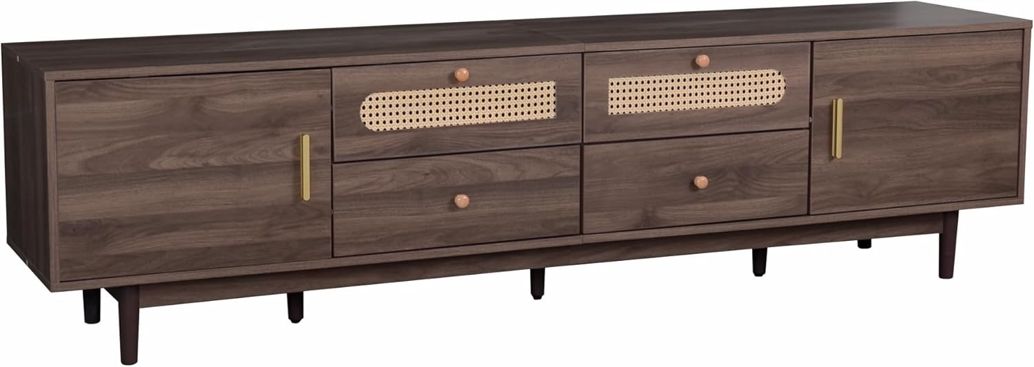 Elevate your living room with this 76.8" TV stand, featuring a rich walnut veneer finish, sleek lines, and rattan drop-down doors that blend mid-century charm with boho warmth.