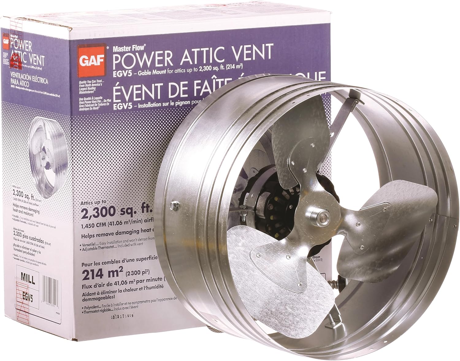 Energy efficient PSC (permanent-split capacitor) helps to reduce energy costs and helps prolong life of the roof and shingles; rust-resistant metal for durability; mounts in the gable inside the attic; adjustable thermostat included; mounting brackets included for installation and optional humidistat available (H1) - sold separately. POWER ATTIC VENTILATORS Net Free Area = 696 sq. ft. Airflow CFM=1450 GAF\MASTER FLOW MAX. ATTIC SIZE = 2300 SQ FT GABLE MOUNT.