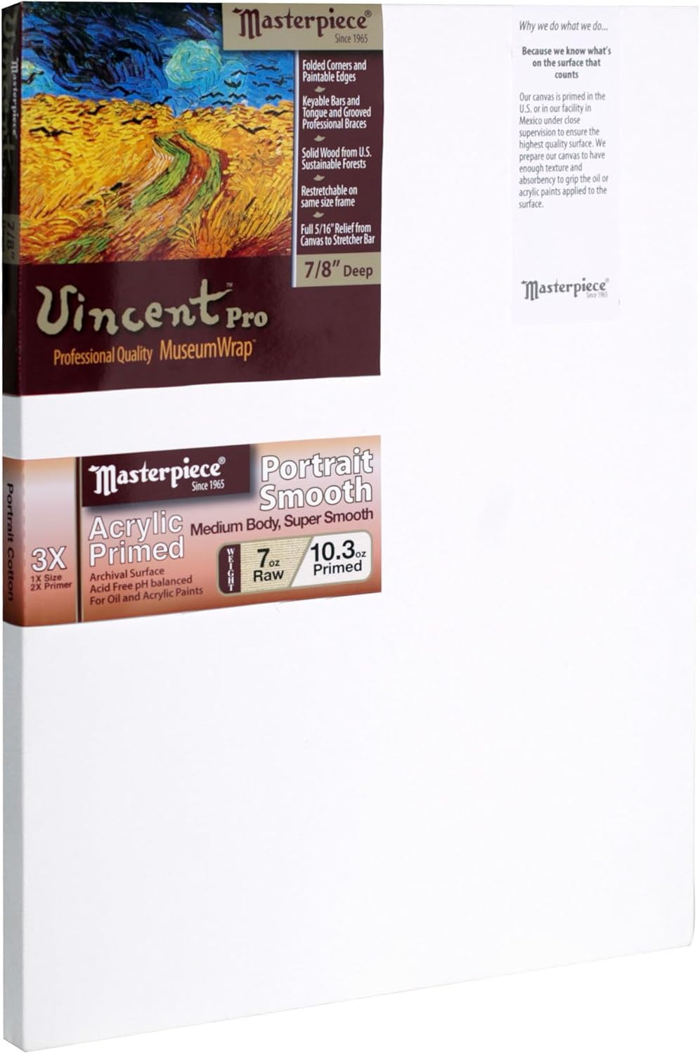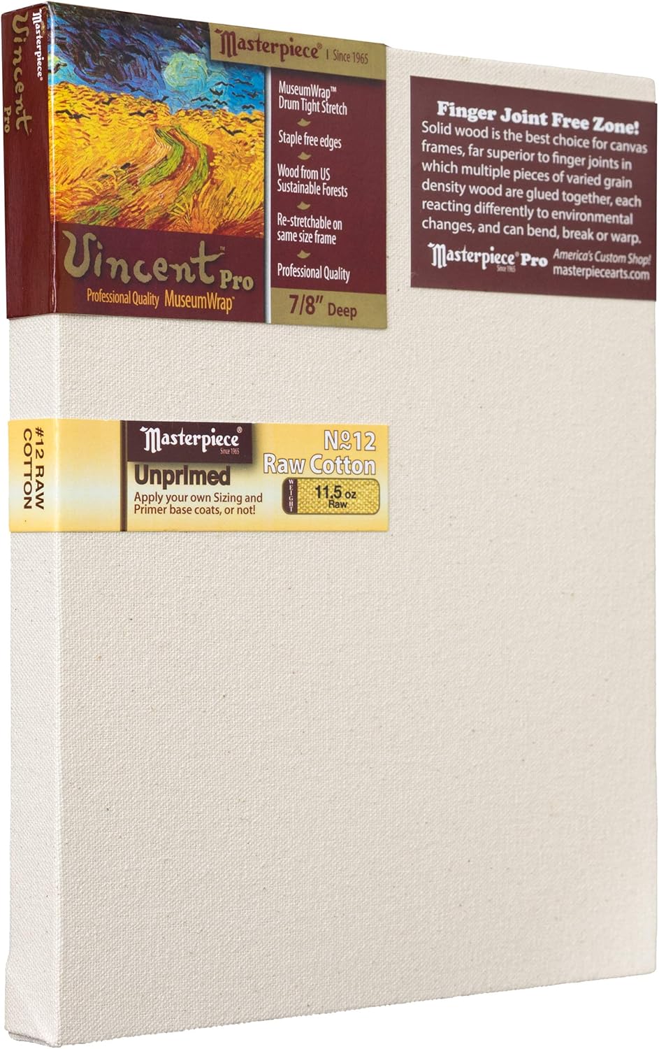 Product Description This 10x12 is a unique size in the 6:5 Aspect Ratio. Pure medium weight Belgian Linen finished to a primed weight of 12 oz.. It is double sized and double primed with archival quality alkyd oil primer, making the ground impervious to paints leaching through and harming the fabric. Suitable for oil or alkyd paints only. It is very absorbent and is a fabulous painting surface. The surface color has an off-white grayish tint. Linen is the world's strongest natural fiber. It has oils that keep it flexible and prevent disintegration over time. The surface has a characteristic linen texture. There is a 5/16" gap between the canvas and frame, eliminating the unwanted lines that occur when the gap is less. We never use finger joints in our wood frames, which often fail under tension and over time - the glue joints give up, and are unsuitable for paintings intended to last for centuries. No brace required for this size. Corner keys are pre-installed. Stretched using our proprietary MuseumWrap method, producing a drum-tight-stretch, up to 50% tighter than other methods, and with balanced tension across the surface. The corners are uncut and neatly folded, making it possible to remove and restretch the canvas on the same size frame. From the Manufacturer For 50+ years, the passion of the Masterpiece team is building the finest artist canvas in America. Just touch one of these impressive products and you’ll immediately discern the quality characteristics that separate this canvas from any other. Masterpiece takes pride in using high quality materials, employing unparalleled workmanship, and continually upping the bar on quality. The importance of artists using a quality made canvas cannot be overstressed. If you use high quality paints and brushes, then don’t waste your resources on an inferior canvas not worthy of your own time, talent, and reputation.Masterpiece canvases are built to last well beyond the artist's lifetime…into the next millennium. Savvy art buyers and art enthusiasts understand that the value of a painting increases when the materials used to create it are of equal quality to the artwork itself. Using a well-made canvas is an investment in your own legacy.Why are Masterpiece canvases so good? It starts with the canvas itself. Natural fiber canvas materials, like 100% cotton and Belgian Linen, are selected and inspected. A sizing is then applied to the canvas that becomes a barrier between the ultimate primer and the canvas material. The primer is specifically designed to provide the ultimate surface upon which your paints will join with the canvas, either chemically and/or mechanically, providing a reliable base or ground for your art.The canvas is then mounted onto a state-of-the-art Vincent Pro frame. When frame sizes are 16” or larger, a brace is applied to the frame; for example, a 12x16 has a single brace, and a 16x16 is cross braced in both directions. The braces prevent the stretcher bar frame from bowing-in so the canvas stays tighter….which is a welcome feature when you paint on the canvas, making the surface more responsive to the artist’s touch. And the canvas stays tight after it’s painted. To increase the tension further, press-in the corner keys and the brace keys further into the slots, which adds tension in the corners and the middle of the canvas, where the tension is needed the most!Vincent Pro canvas is MuseumWrapped, which is Masterpiece’s proprietary stretching technique that achieves: a drum-tight stretch, balanced tension across the canvas surface, neatly folded un-cut corners, and paintable edges. It’s the absolute best way to stretch a canvas.When your art matters, choose Vincent Pro…a truly professional canvas in every way!