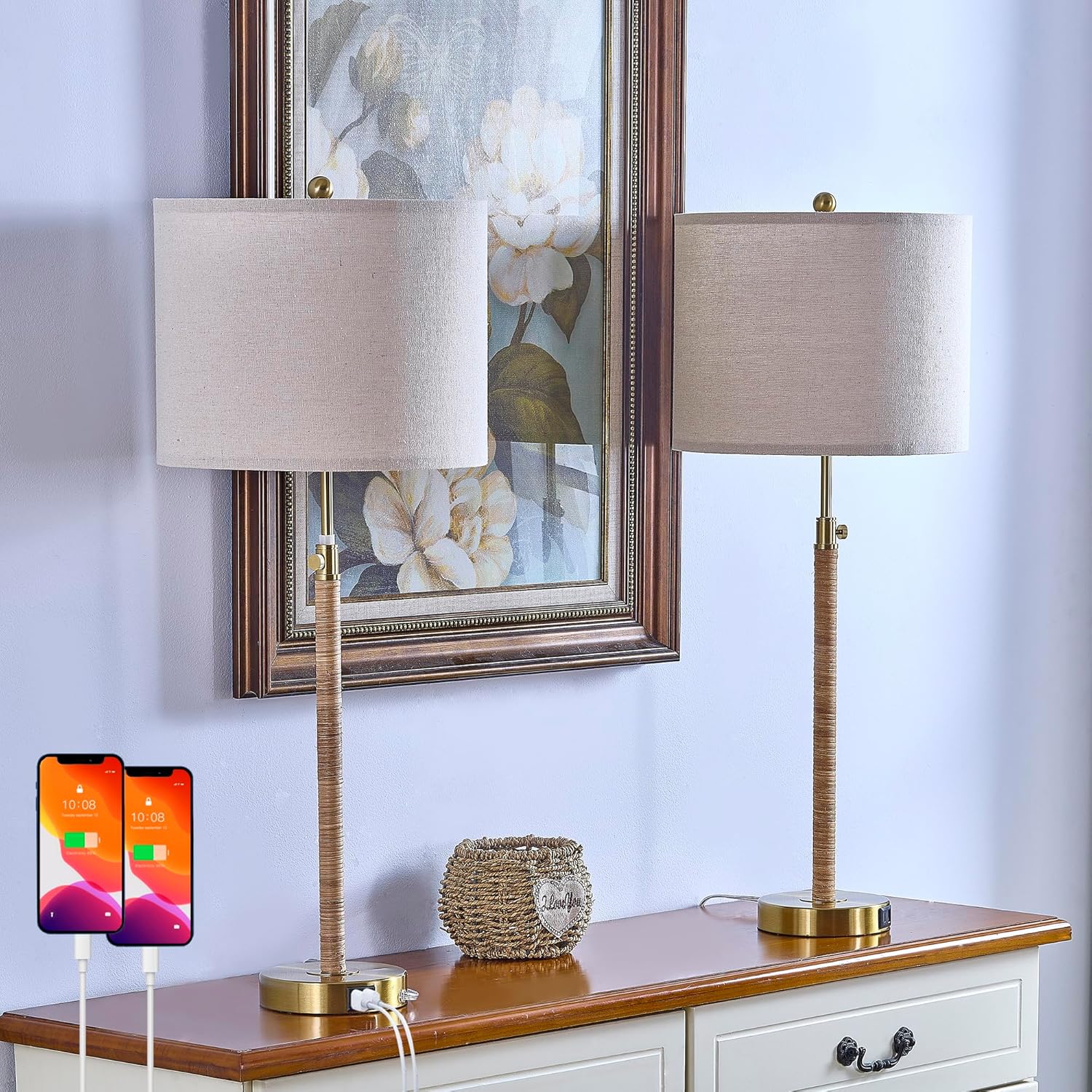 Height-adjustable table lamp is a lamp with heights ranging from 26 to 33 inches, and its adjustability can fit your space. It is built with a solid 5-inch diameter metal base and equipped base for safe use. They can bring elegant decor to bedrooms, living rooms, hotels and rooms. The Farmhouse Bedside Light has 2 built-in USB charging ports (USB-A and Type-C, 5V/2A) to charge your phone, tablet or other devices. Rattan Buffet Table Lampis made of high-end beige linen, which creates an easy warm, soothing glow of the eyes. This mid-century nightstand light is compatible with standard E26 bulbs and supports maximum wattage (not including bulbs). In addition, you can simply complete the installation by following the installation instructions.