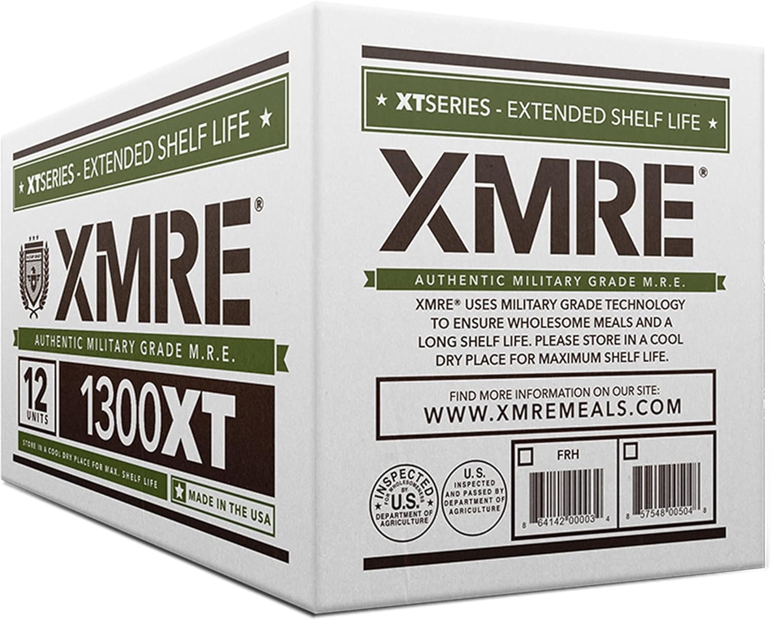 THE XMRE 1300XT PROVIDES 1,300 – 1,500 CALORIES OF US MILITARY GRADE, READY TO EAT MEAL COMPONENTS. ALL COMPONENTS ARE FIELD TESTED AND FULLY COOKED SO THEY CAN BE EATEN RIGHT OUT OF THE POUCH. THE 1300XT IS ALWAYS FRESHLY PACKED WITH COMPLETE NUTRITIONAL INFORMATION PRINTED ON THE BACK OF EACH BAG. THE XMRE 1300XT IS DESIGNED AS A MILITARY MRE MEALS THAT CAN ALSO MEET THE NEEDS OF THE CIVILIAN MARKET. EACH OPTION INCLUDES 12 MRE MEALS PER CASE.