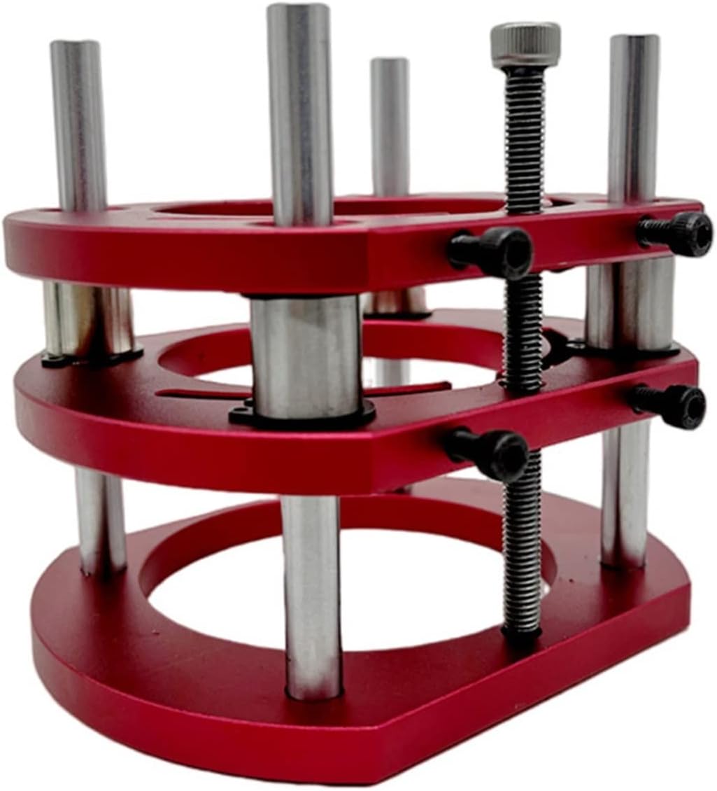 Router Lift 65mmDiam Motors Router Lift Table Base Alum Woodworking Router Table Insert Plate Board for Trimmer Engravinger Base Specification: Material: aluminum alloy+stainless steel Color: red Maximum lifting stroke: 51mm (2inch) Lifting mode: manual lifting, equipped with manual lifting rod Mounting screw hole position: 70 * 62mm Suitable for trimming machine: universal type, suitable for trimming machine with motor diameter between 64~66mm Package includes: Router lift x 1pc