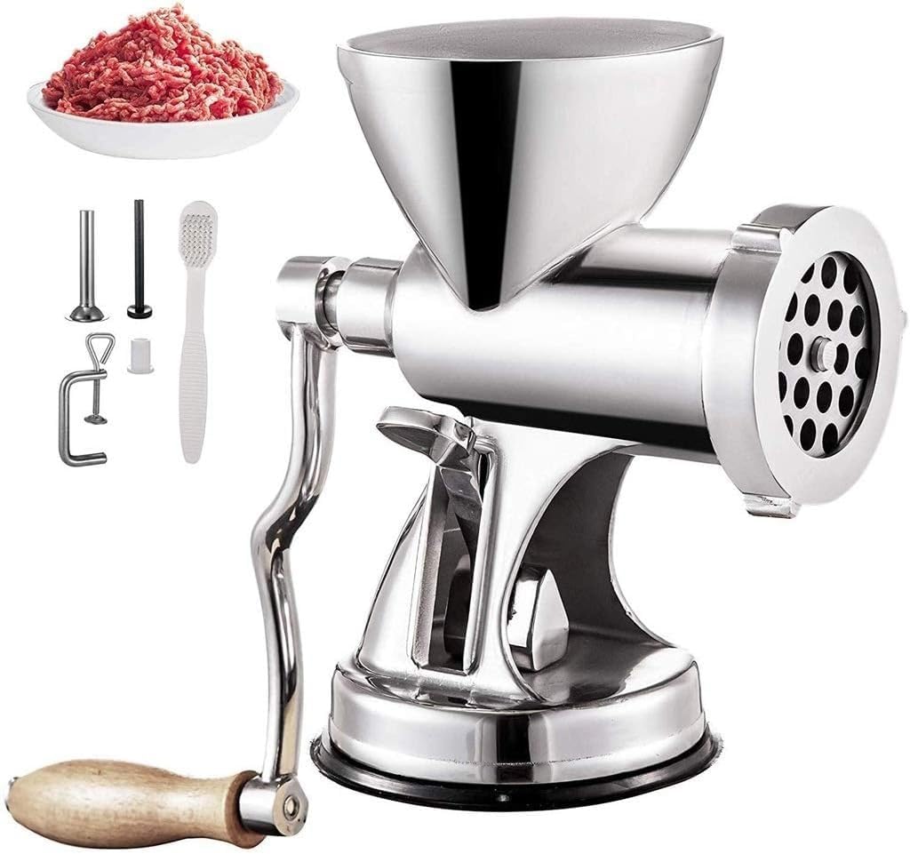 Manual meat grinderThis is a meat grinder home use, all made of 304 stainless steel, sanitary and durable. It can be easily assembled for easy cleaning. It is widely used for grinding meat, vegetables and nuts, which is perfect for long-term use manual food processing.CharacteristicStainless steel - meat grinder with metal polishing surface, made of rust-resistant and easy to clean all 304 stainless steel.Design of the fixing - This manual grinder with a bottom attached to the chuck stable plane. Easy fixture comprising a mesa.Replaceable orifice - 2 different sizes of the hole plate, 8 mm and 5mm, which may be replaced as need.Sausage stuffing tube - meat grinder equipped with a hand crank sausage stuffing tube, the tube may be used as a sausage maker.SpecificationsMaterial: 304 stainless steelOrifice size: 0.2 "(5 mm) /0.3" (8 mm)Package Contents1 x manual meat grinderSausage stuffing tube 1 ×Desktop clamp 1 ×2 × well plates (5 mm / 8 mm)1 × push Meat1 × PA sleeveTips:*Due to manual measurement, there may be some errors, please allow 1-3cm difference, thank you.*Because the spotlight and different people have different understandings of color, there may be a certain color, but within a reasonable range, please choose carefully.*If you need other styles, please contact me, our store has a variety of styles and colors, you can view my store.you have any questions, please contact us by email and we will get back to you as soon as possible.