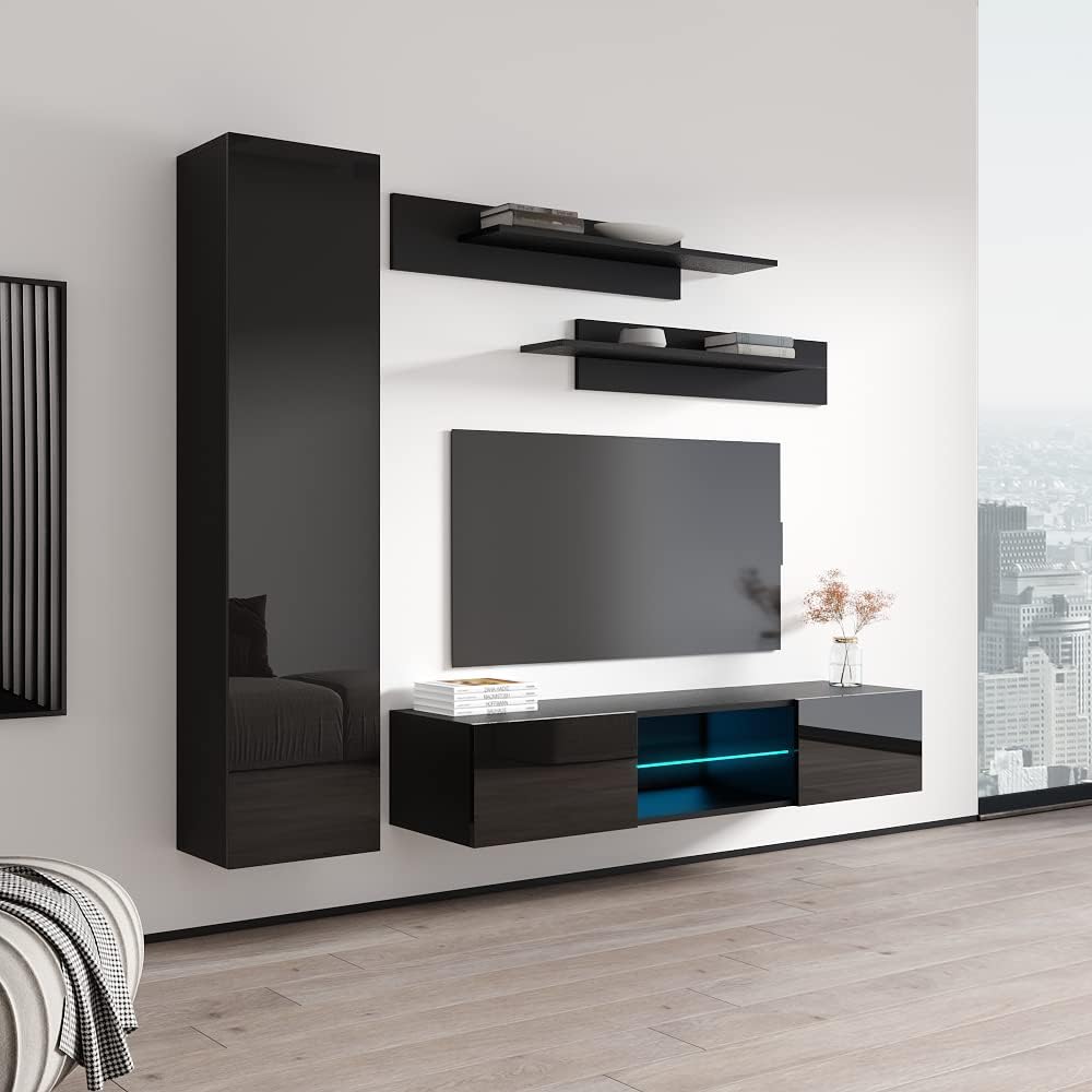 The Fly G3 33TV Stand by Meble Furniture offers a modern wall-mounted entertainment solution that combines style and practicality. Measuring 59.1 inches wide, 13.8 inches deep, and 19.7 inches high, this floating unit supports TVs up to 65 inches and frees up valuable floor space, making it ideal for living rooms and bedrooms. Constructed from sturdy engineered wood with a matte finish and high-gloss fronts, the unit delivers a sleek, contemporary look. A built-in 16-color LED lighting system allows you to customize the ambiance with ease, controlled via remote. Thoughtfully designed storage compartments and open shelves provide ample room for media players, gaming consoles, and accessories, ensuring a tidy environment. Easy to clean and equipped with all mounting hardware, this entertainment center enhances your home with both function and modern style. European-made quality ensures durability and long-lasting appeal.