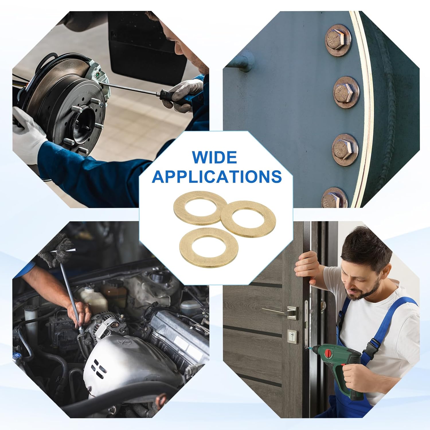 What is this?This M6 flat washer is made of Brass, with its core function of dispersing pressure, protecting surfaces, and enhancing connection stability. It fill for small gaps between parts through gasket thickness, making connections tighter. It is mainly used in mechanical manufacturing, automotive industry, electronic equipment, and more.What will I get?The metal washers we provide here is in size of:Washers for screws: M6;Outer Diameter: 12mm/0.47 Inch;Inner Diameter: 6mm/0.24 Inch;Height: 0.8mm;Material: Brass;Color: Gold;Material: Brass;Package Included: 38Pcs x screw washers.Are there any advantages of the product?This fence washer is made of brass material with a smooth surface, which has high strength, wear resistance, corrosion resistance, oxidation resistance, and good thermal and electrical conductivity. Suitable for indoor and outdoor use.How to use it?Select the flat washer of the corresponding screw model, place the flat washer around the end of the bolt or screw, and then thread it through the component to be connected. Use tools such as wrenches, screwdrivers, etc. to tighten the nut onto the bolt and secure it in place. Flat washers will be distributed on the connection surface to provide protection and support.What should I notice?Due to manual measurement, there may be a 1-2mm error in the product.