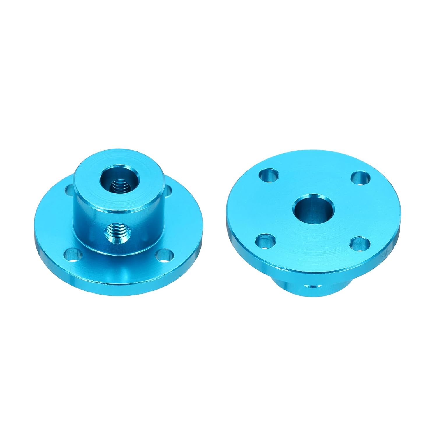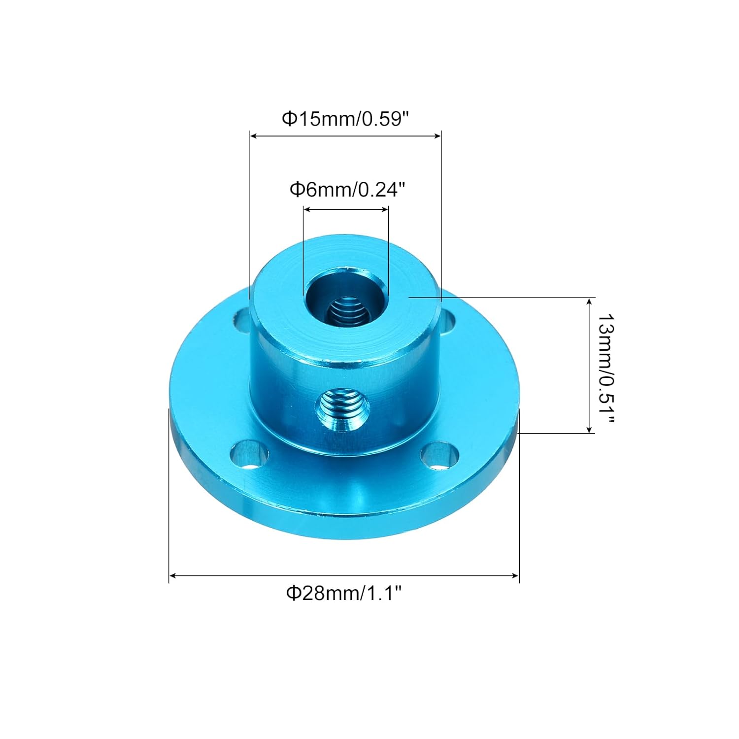 • Product Name: Flange Coupler Hub; Color: Sky Blue; Material: Aluminum Alloy; Mounting hole inner diameter:3mm/0.12 inch; Cylinder Size:6mmx15mmx13mm/0.24 inchx0.59 inchx0.51 inch(ID*OD*H); Base Plate Thickness: 3mm/0.12 inch; Base Plate outer diameter: 28mm/1.1 inch;