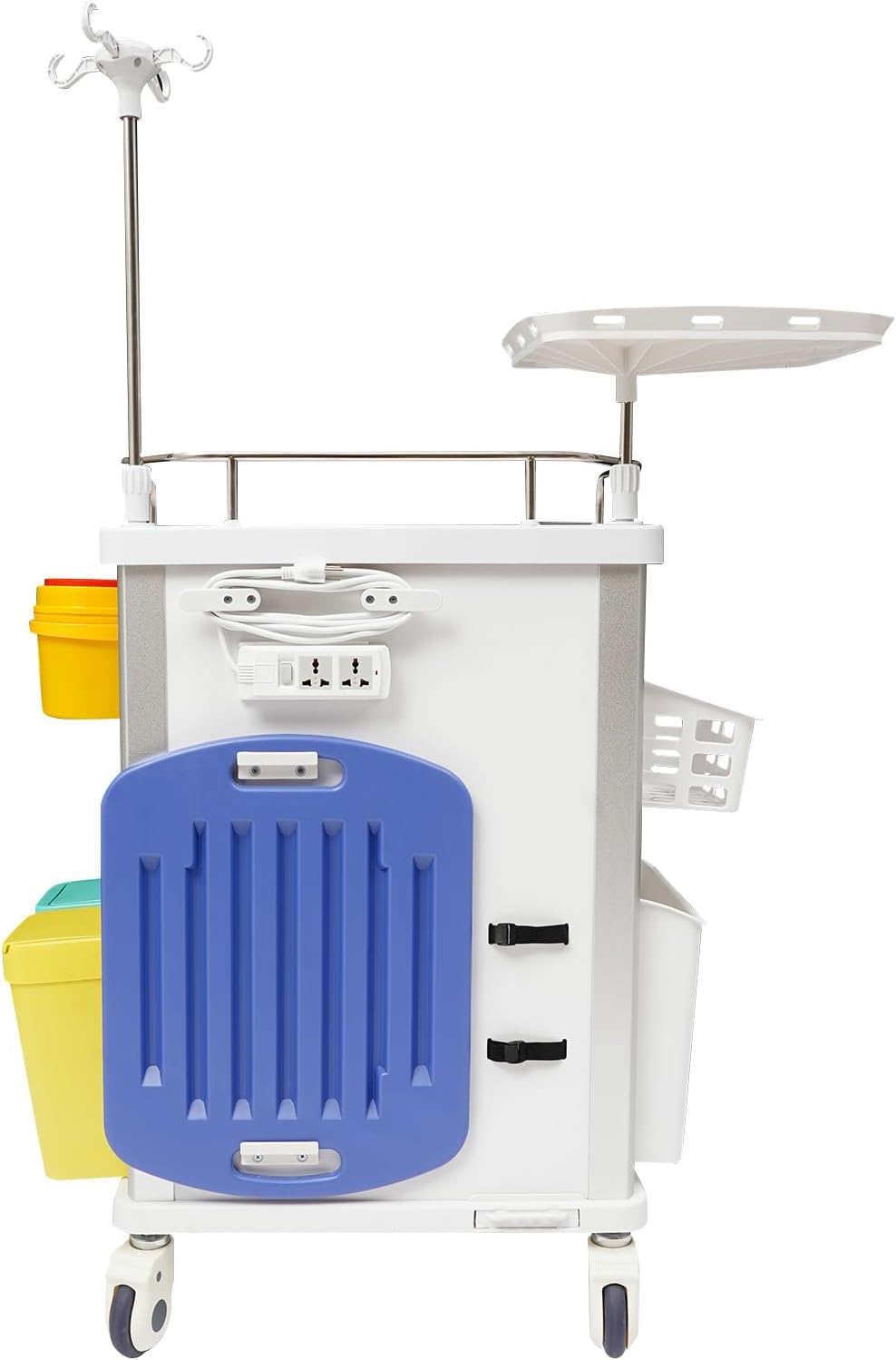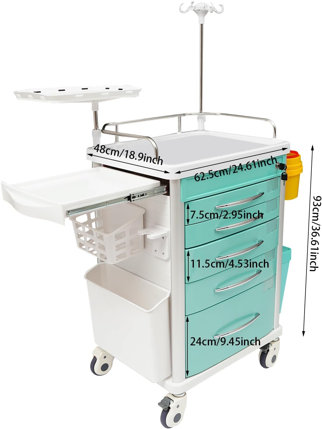 DescriptionDesigned for hospitals and clinics, this medical trolley equipped with multi-drawer storage and side boxes, it simplifies the classification and storage of items and consumables. Its top work surface provides stable support for equipment, files, etc., and the 4 universal wheels ensure both flexible mobility and secure parking. It effectively keeps work essentials neatly in place.Details Tag Slots: You can insert the corresponding tags into them, making it easier to quickly find the corresponding item.Cord Wrapping Shelf: It is convenient for you to store the power cord without tangling and mess.Safety Retention Straps: The retention straps on the defibrillation platform can be used to secure defibrillator equipment from falling. The straps on the oxygen cylinder tray can be used to secure oxygen cylinders.ApplicationIt is suitable for hospitals, clinics, beauty salons, nursing homes, and laboratories to store various medical tools.SpecificationMaterial: ABS, Aluminium Alloy, PVC, Stainless SteelStyle: Modern Color:Green/Blue/Red, WhitePower Source: Corded ElectricPlug Type: US StandardVoltage: 120V 60HZTotal Load-bearing Capacity: 80kg/176.37 lbsInfusion Stand Load Capacity: 2-5kg/4.41-11.02 lbsPower Cord Length: 3m/9.84ftNumber of Wheels: 4 (Two with Brakes)Number of Drawers: 5Platform Size: 62.5*48cm/24.61*18.9inProduct Height: 93cm/36.61inNet Weight: 36kg/79.37 lbsPackage Included1*Medical Trolley2*Trash Cans1*CPR Board1*PVC Mat1* Movable Outside Container1* Needle Disposal Holder 1* Side Basket 1* Power Strip2*KeysAll Accessories for Assembly