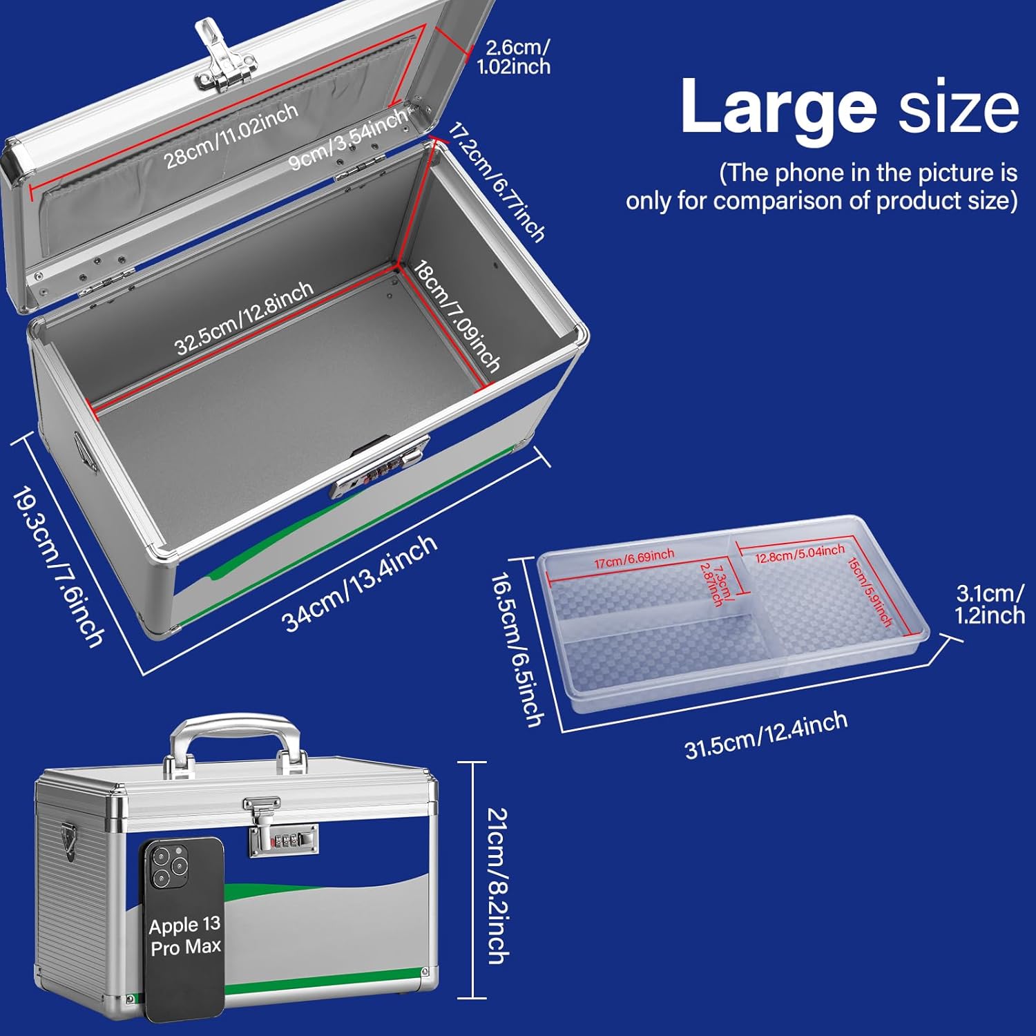 | Included Components | Combination lock box + plastic tray + shoulder strap |