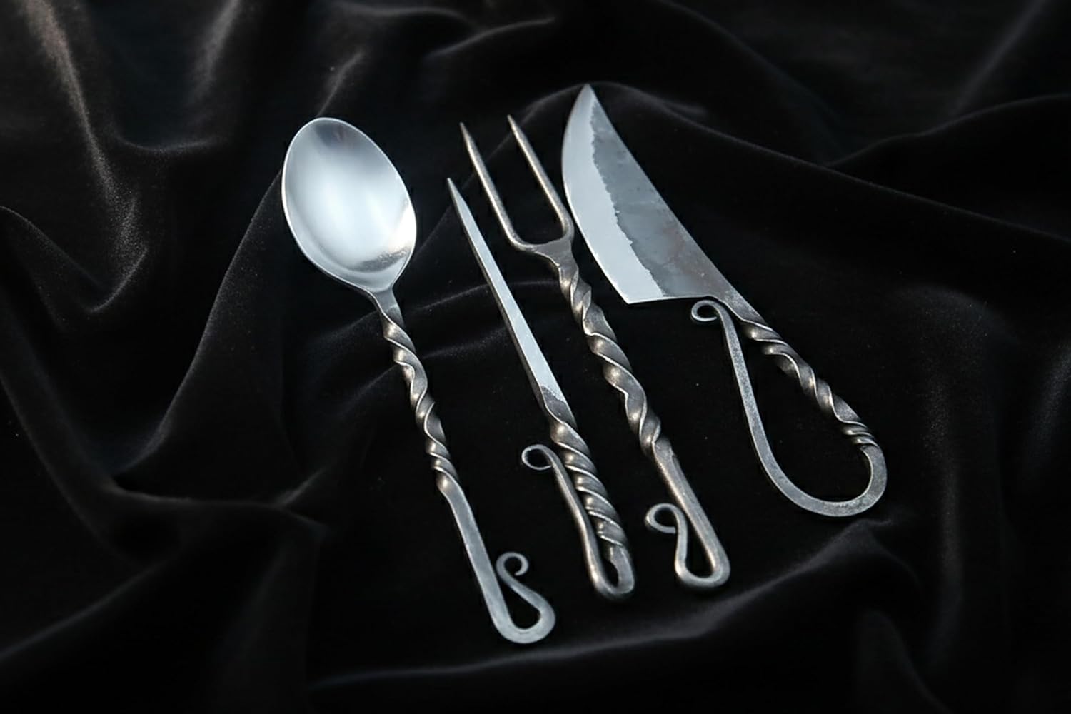 Step back into the age of warriors and blacksmiths with the STIFF HIDES Medieval Hand-Forged Viking Silverware Set—a rugged, beautifully crafted 4-piece cutlery set designed for those who appreciate tradition, craftsmanship, and historical style.Each utensil is individually hand-forged using premium alloy steel, featuring a striking black finish and twisted metal handle inspired by ancient blacksmithing. Because every piece is handmade, no two sets are exactly alike—each one is a functional work of rustic medieval art.This set includes: Fork Knife Spoons Food Stick Perfect for Viking reenactments, LARP feasts, rustic home dining, outdoor cooking, camping trips, and collectors who cherish authentic craftsmanship. The full-size 12-inch dimensions make it suitable for everyday use while preserving historical proportions.Premium Leather Storage Case Included The set comes with a handcrafted leather storage case featuring individual utensil slots for protection and organization. This case adds a rich medieval touch while making the set easy to carry to campsites, festivals, or events.Built for Durability & Timeless Appeal Hand-forged alloy steel ensures years of use while enhancing the raw Viking aesthetic. Ideal for history lovers, outdoor adventurers, reenactors, or anyone who appreciates distinctive, handcrafted tools.A Unique Gift for Any Occasion A perfect gift for Father’s Day, Birthdays, Anniversaries, Christmas, or for anyone who values traditional craftsmanship and medieval-inspired design.Rediscover the spirit of the Viking age—one meal at a time.