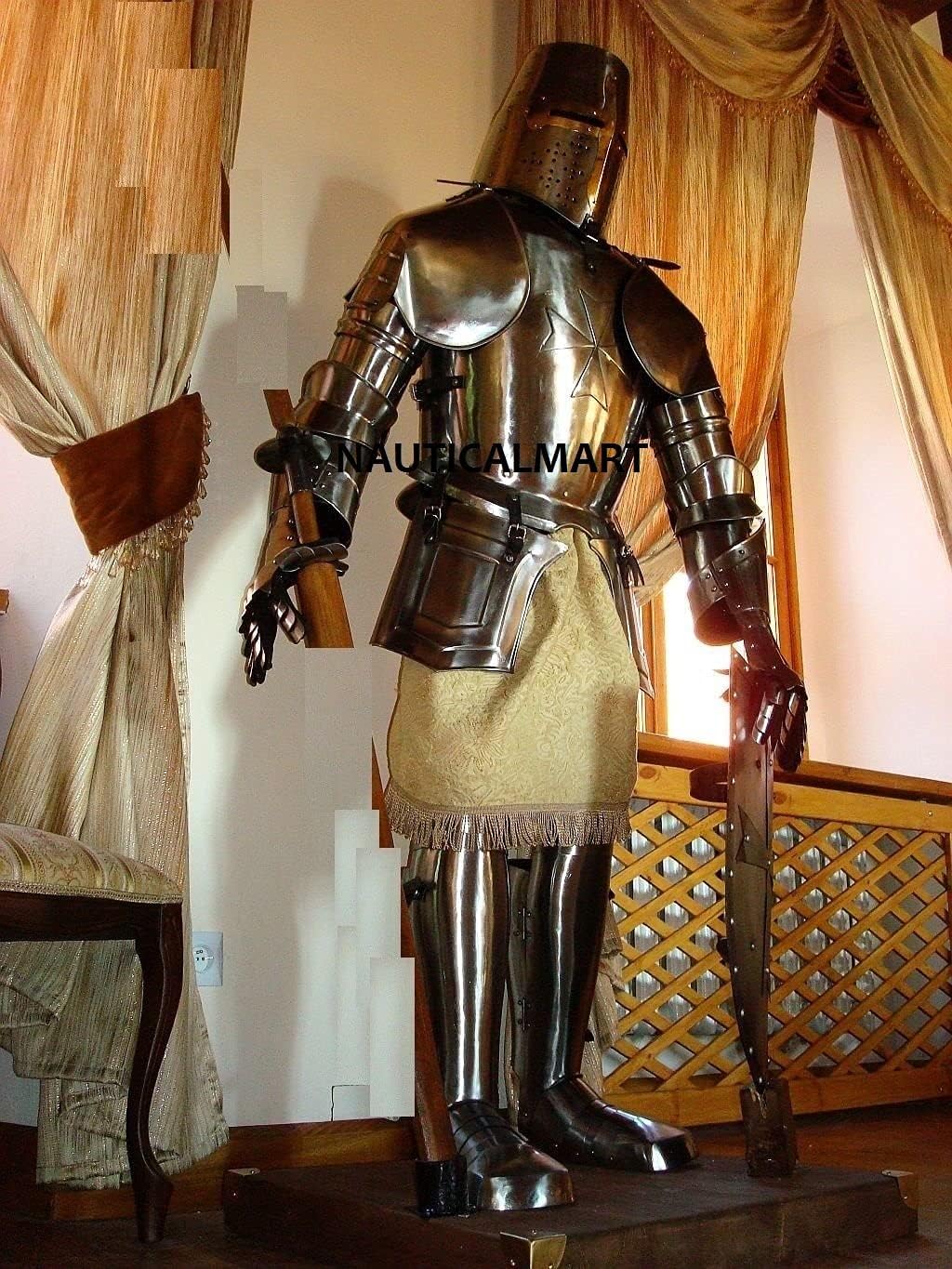 Made Of Good Quality Steel 18gauge Steel suit of armour came into use at the beginning of the 15th Century. The suit of armour was worn over regular underclothes and was attached to the wearer using leather straps and buckles. IT was used to protect areas that could not be protected with plate armor. Suit of armor usually consists of thehelm,