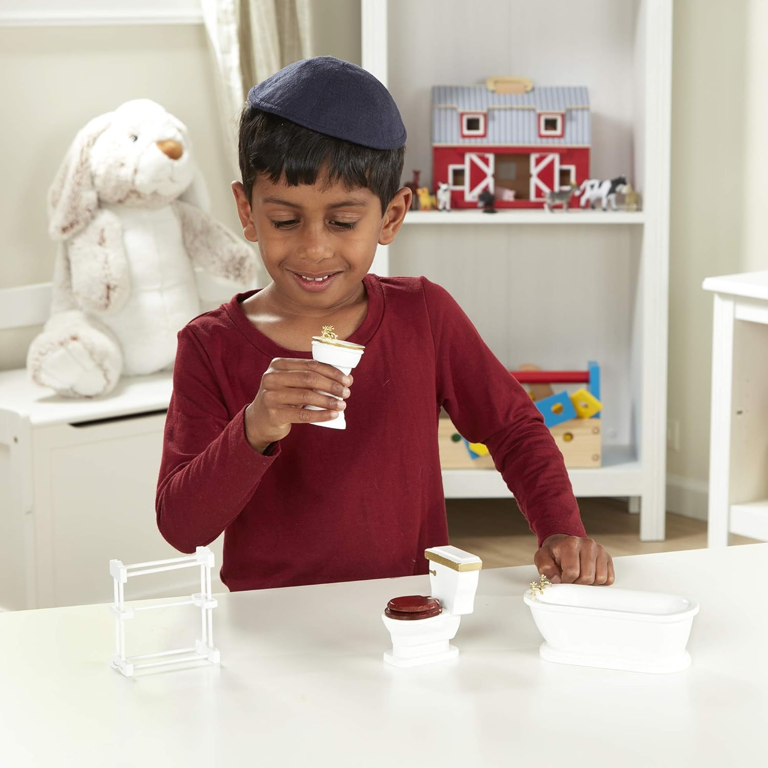 Product Description This exquisite four-piece bathroom set has everything needed for this very "necessary" room. This set includes handcrafted wooden pieces that are elegantly detailed with brass knobs, carved frames and a toilet seat that opens and closes. The luxurious pedestal sink and tub overflow with Victorian charm! This beautiful set is perfect for the Melissa & Doug Victorian Dollhouse and all 1:12 scale dollhouses. (Also available in this style: Kitchen, Dining Room, Living Room, Bedroom and Nursery furniture sets.) For more than 30 years, Melissa & Doug has created beautifully designed imagination- and creativity-sparking products that NBC News called “the gold standard in early childhood play.” We design every toy to the highest quality standards, and to nurture minds and hearts. If your child is not inspired, give us a call and we'll make it right. Our phone number is on every product! From the Manufacturer From classic wooden toys to crafts, pretend play, and games, Melissa & Doug products provide a launch pad to ignite imagination and a sense of wonder in all children so they can discover themselves, their passions, and their purpose. Since the company’s founding more than 25 years ago, Melissa & Doug has consistently delivered innovative products that inspire open-ended thinking, encourage kids to see new possibilities, and offer Countless Ways to Play. It’s part of a bigger vision to Take Back Childhood. Because by giving children a true childhood with the space and freedom to explore their world, we give them a path to realizing their full potential!