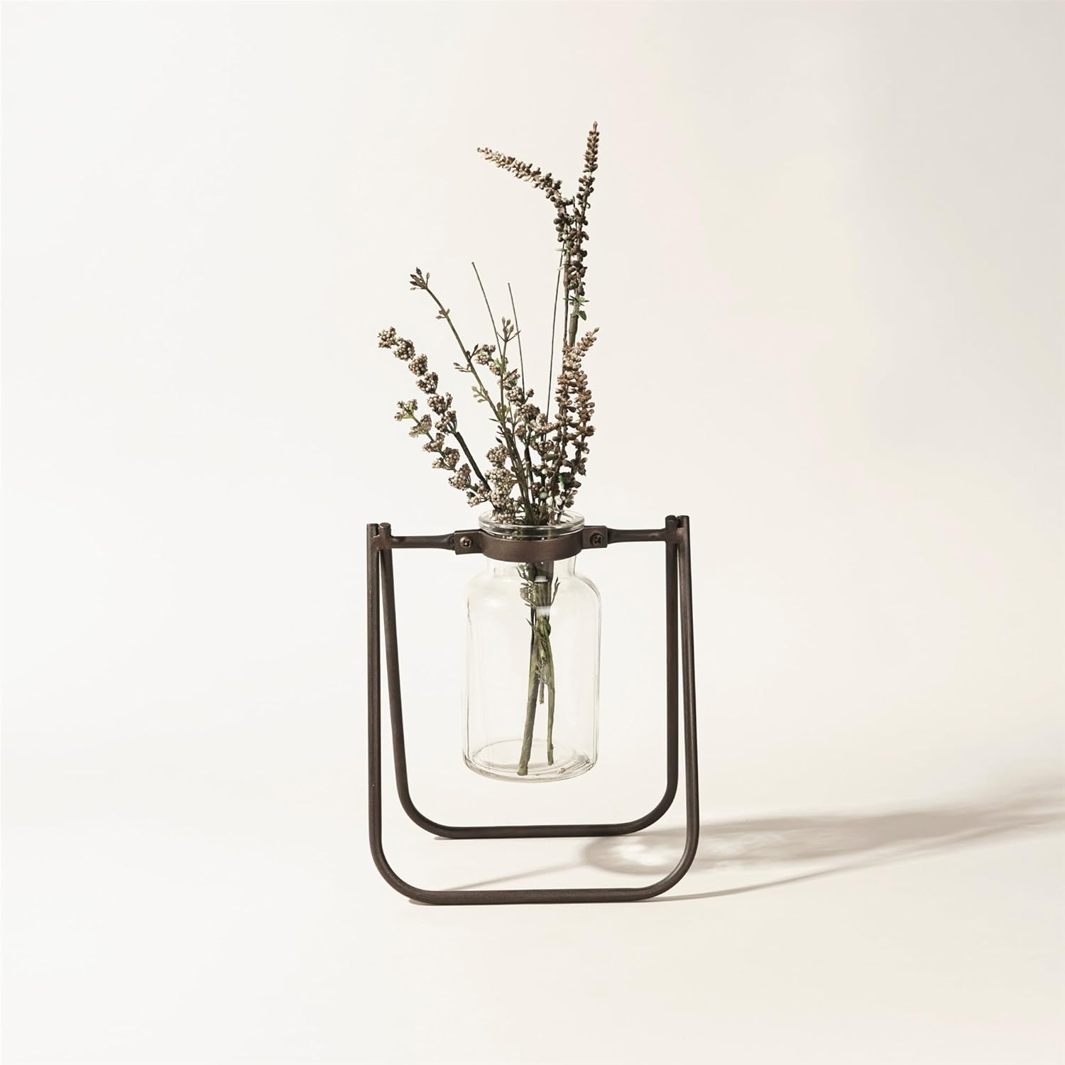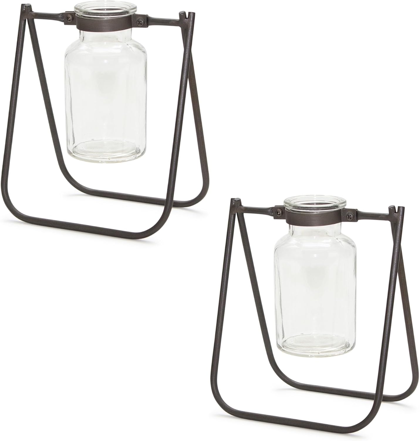 Elevate your home decor with this beautiful hanging jar vase with antique-looking frame stand. Featuring a rustic brown finish paired with delicate glass jar inserts, this piece adds a touch of elegance to any room. The high-quality composition ensures durability, and the set is perfect for displaying fresh cut floral buds or elegant faux stems. Product Features:. Set of 2 brown and clear hanging jar vases. Comes with antique-looking frame stand. Rustic brown finish paired with delicate glass jar inserts. Perfect for displaying fresh cut floral buds or elegant faux stems. For indoor or outdoor covered use Dimensions: 6.75"H x 6"W x 4"D. Material(s): iron metal/glass