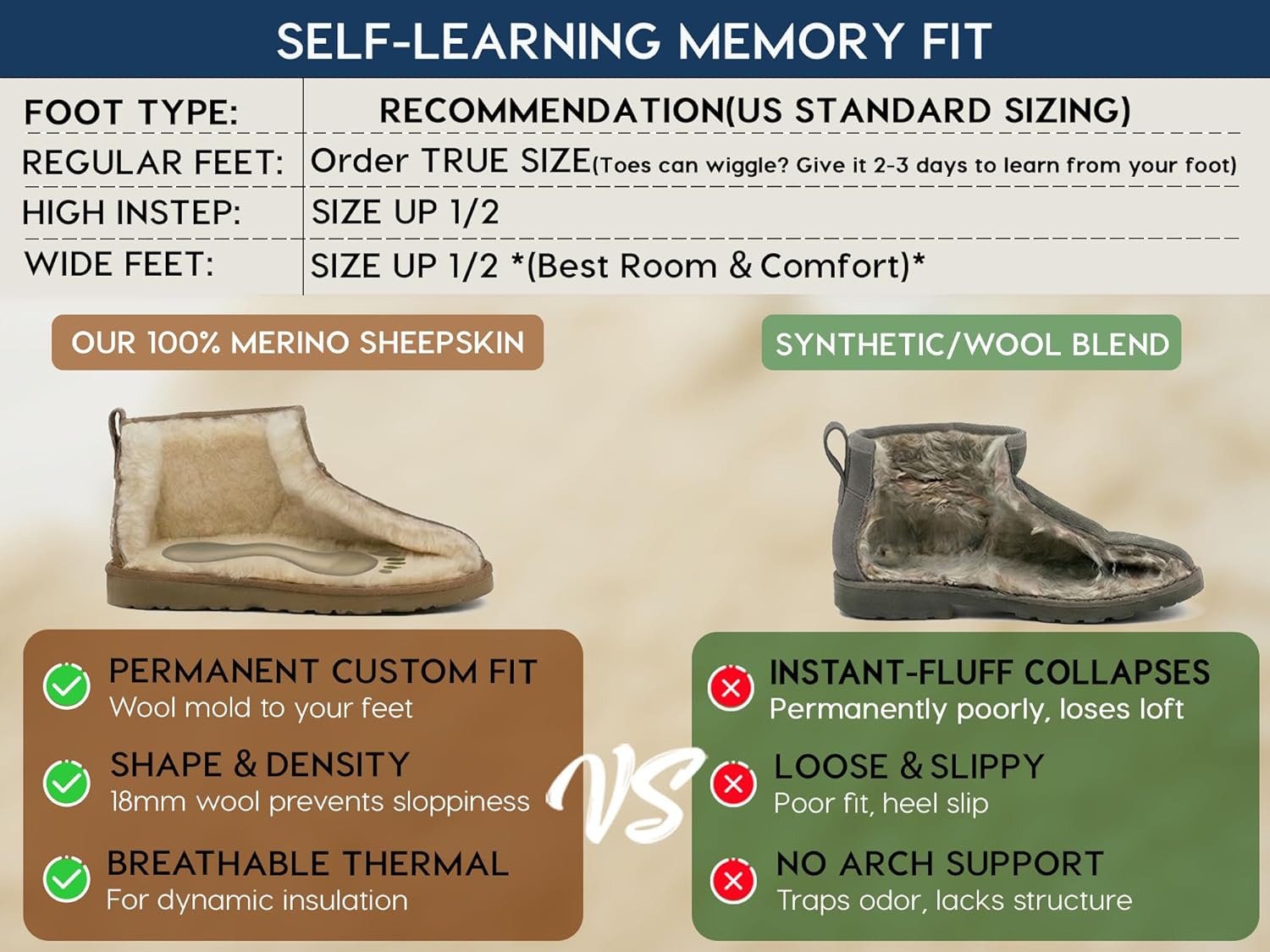 | Sole Material | Buyer’s Guide: MelSyd mini boots use luxury 100% Australian Sheepskin—snug at first, then mold to your feet. Pls Measure Accurately first! Thick socks? → +½ size up; Wide feet? → +1 size (if wide not available); High instep? → +½ size + wear socks to stop slipping; Very high instep? → Skip these—they won’t fit over your foot. |
