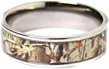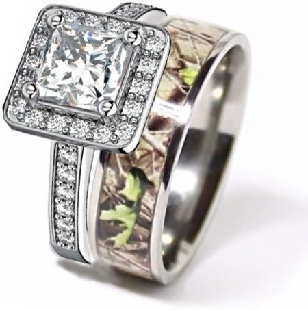 Men's and Women's bands are made of Titanium and decorated with Camo design and protection resin layer. Men's band is covered with black IP plating Width: 8 mm. Women's Engagement ring is made of Sterling Silver and finished with Rhodium. The main stone: 1.43 CT (6 mm) Cubic Zirconium round cut stone. CAMO PATTERN MAY BE A DIFFERENT TONE THAN PICTURED