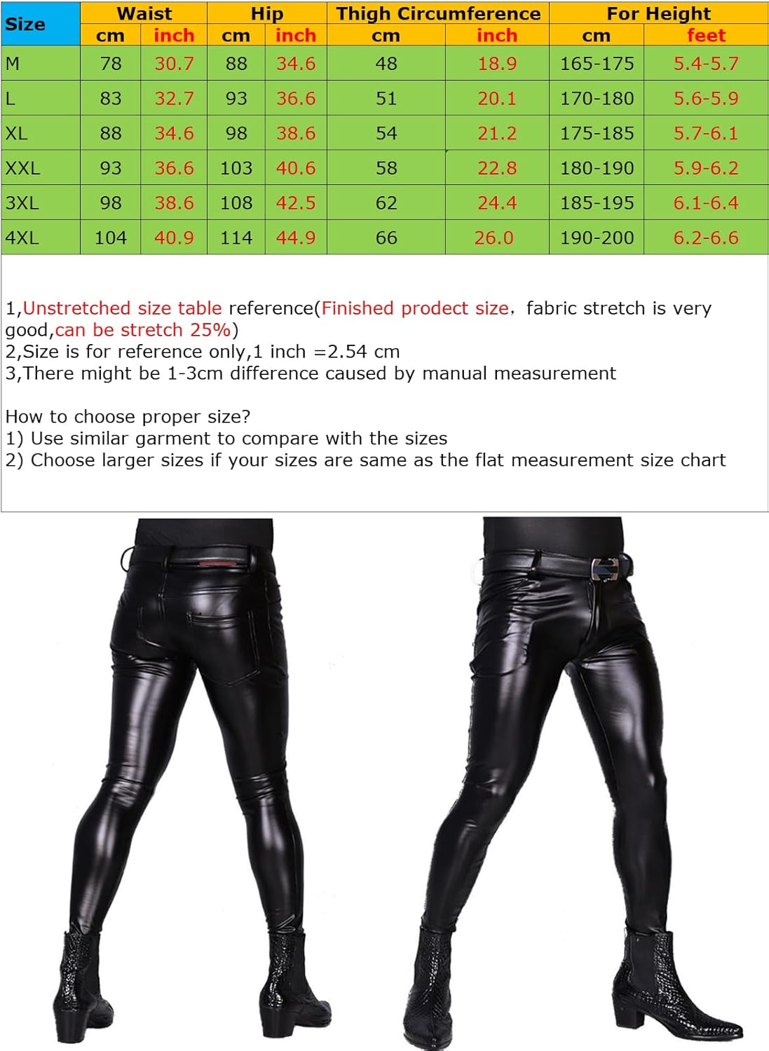 Color: (as pictures shown)Size:M-4XL.Tight-fitting design:Tight-fitting design with comfy elastic waistband and wearing experience, the fit version has a contraction adjustment on the waist.Lift the buttocks and the lower back position as much as possible to highlight the leg contour.Hip line and tight calf:Finishing the buttocks elastic line shows the midline of the hips, the compact design of the calf fits shows the slim figure.Comfortable Smoothing: Wet Look, Smooth, comfortable to wear, not rolled edge. This sexy pant shows your body curvy and makes you be the attractive male and become the focus of any romantic occasions.Also,Perfect for any season and any occasion,fit to fitness and exercise,running,yoga or other sport.Care Instructions: Hand wash in cold water, line dry, do not bleach and iron.If you need to keep your clothes shiny, you can buy oil to polish the leather.Note:The size is of manual measurement, please allow slight 1-3cm difference and check whether the size fits you before you order.Photo color might be a little different from the actual product due to color display of different monitors.Please contact us for any questions, we treasure each transaction and we are trying our best to serve you a satisfying deal.