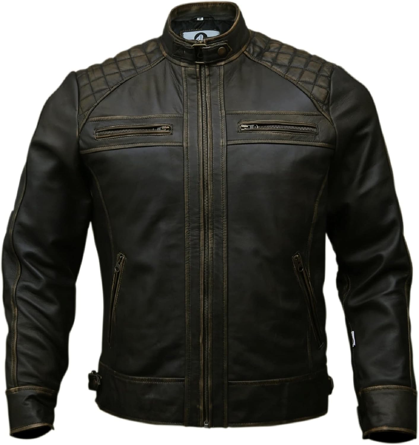 This Men's Leather Biker Jacket is your primary choice! For biker lovers, here is an eye-catching design that will make you stand out from the crowd. It features a sturdy YKK zip front up to a stand collar with a buckle and loop strap to hold it in place. The raglan-style shoulder panels are top-stitched into a diamond quilt pattern, and there are leather panels at the elbow. MADE OF GENUINE LAMBSKIN LEATHER: Rest assured that you own a motorbike coat of superior quality. All hand-picked materials used are durable and comfortable to wear. This design is clearly built to last and withstand harsh weather conditions for years to come. High-Level Purity and Perfection in one Leather Jacket: Details: 100% Handmade - Imported Genuine LambSkin Leather YKK Branded zippers Zipper Pockets Straps for Structured Fit Premium Stitching Throughout 100% Polyester quilted Lining 30 Days - Easy Returns - Exchanges We offer true American Sizes Don't Hesitate! Indulge Yourself! If you want to save your hard-earned money and enjoy a premium-quality leather jacket, click "Add To Cart" NOW!