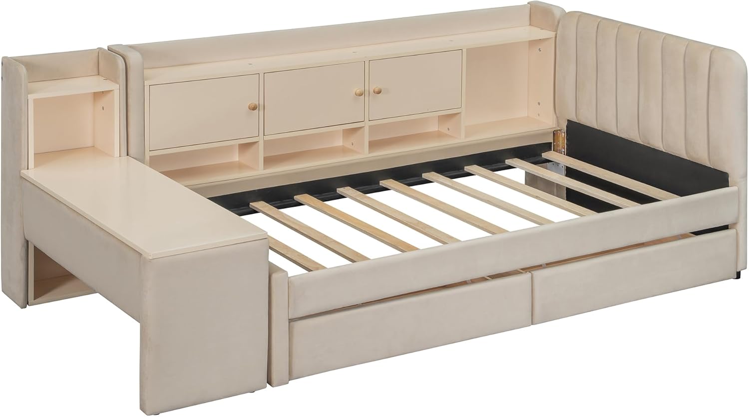 🛏️ Twin Size Upholstered Daybed with Drawers, Shelves & Flip Cabinets 🚀 Multifunctional Space Saver – Combines sleeping area, storage solutions, and side table in one sleek unit 📦 Core Specifications Material: Premium velvet upholstery Size: Twin Color Options: Beige/Gray Packages: 3 boxes 📏 Technical Details Overall Dimensions: 95.6"L x 49.1"W x 37.6"H Weight Capacity: 400lb Product Weight: 218lb Mattress: 6" thickness required(Mattress not included) 🔨 Assembly & Construction Slat System: 10 reinforced wooden slats Spring Box: Not needed Assembly: Required 🗄️ Storage Components 3 smooth-glide drawers Flip-up cabinet doors Open display shelves Integrated bedside table Full-perimeter safety rails ⚠️ Important Notes ±0.5" size variance possible Actual colors may vary slightly Monthly hardware checks recommended Weight limit strictly 400lb