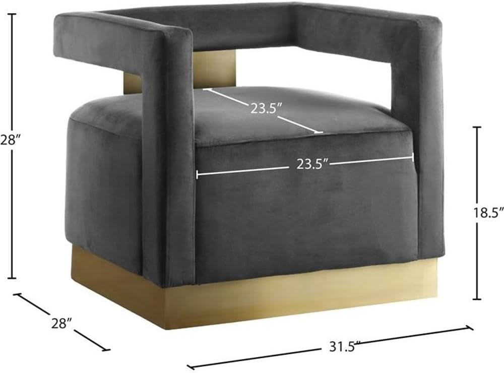 Liven up your living quarters with this unique Armani Grey Velvet Accent Chair from Meridian Furniture. Featuring a square frame design with right angle openings at the arms and back, this chair puts the “mod” in modern. Rich grey velvet upholstery gives the chair a soft, comfy texture that you’ll want to get cozy with, and its gold steel base and back complements its dark upholstery while providing solid support. This chair is the perfect addition to any room in your contemporary home.