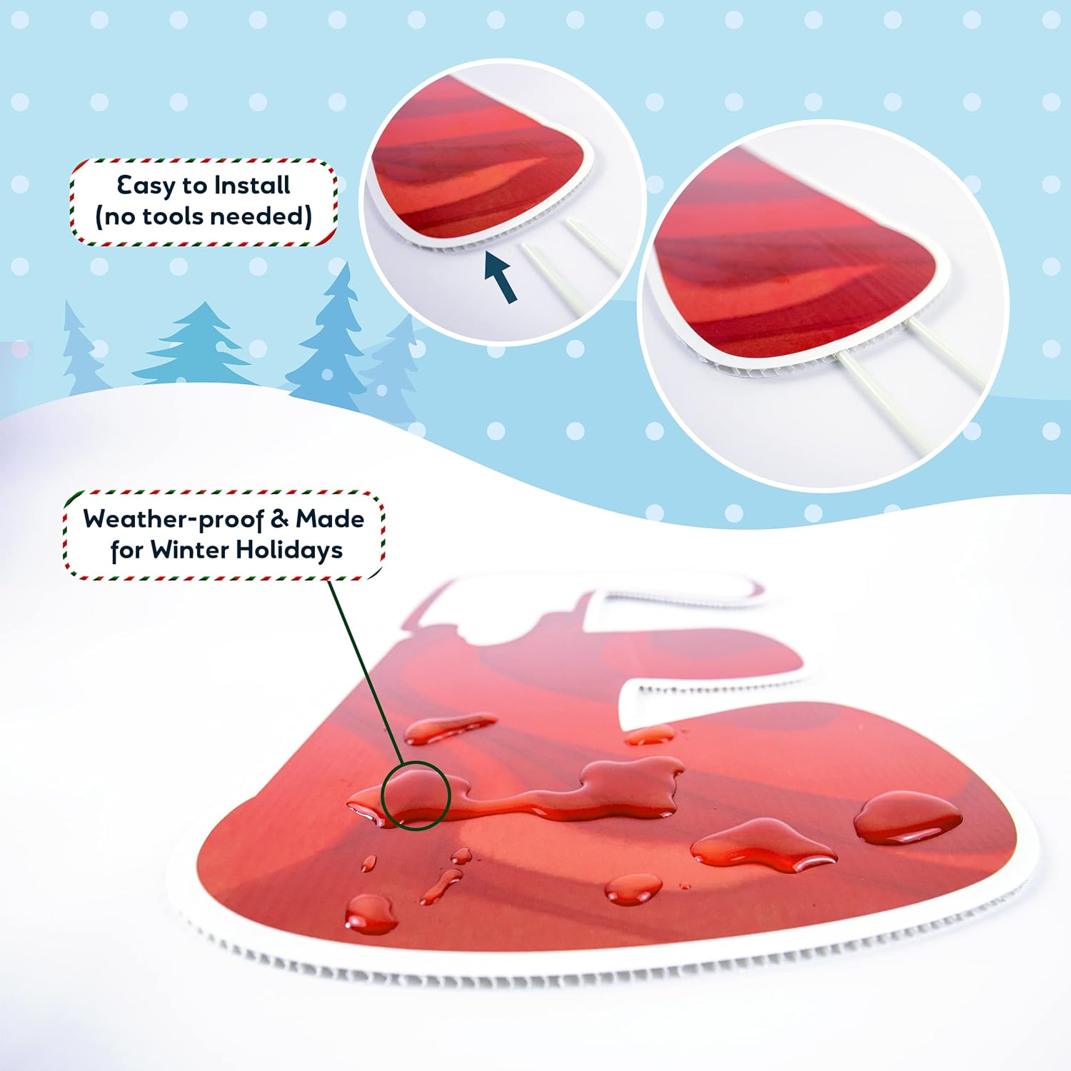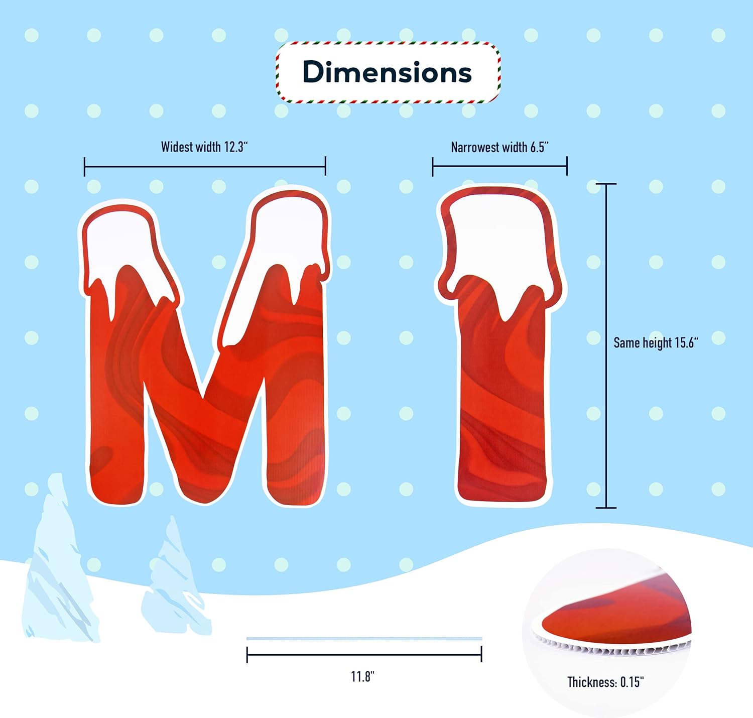 Happy Holidays! Our Christmas outdoor yard sign set is a yard decorations pack for Christmas holiday season. Made of quality corrugated plastic boards, each sign letter is printed with a snow-themed red and white design on one side, and all together it can spell "Merry Christmas" . Except letter "i" which measures 16 inches tall and 7 inch wide, each one roughly measures 16 inches tall and 12 inches wide. And the thickness of the sign is about 0.15 inch. SET INCLUDES 14 pcs of separate letter cards. 28 fiberglass stakes Nuestro juego de letreros de Navidad para el patio es para decorar el exterior del hogar. Hecho de cartones de plástico corrugado de calidad, cada letra de letrero está impresa con un diseño rojo y blanco con temas de nieve en un lado, y todos juntos pueden deletrear "Feliz Navidad". Estos letreros encajarían bien con todos los demás adornos navideños en el exterior.