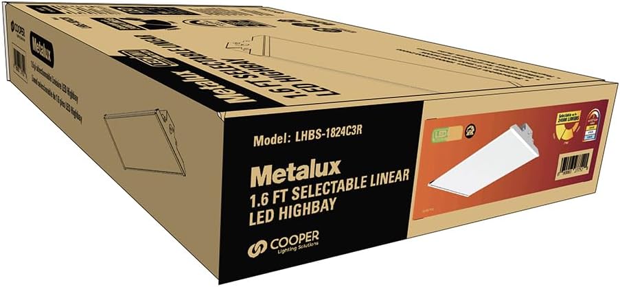 The Metalux LHBS is a 1.6 ft Linear LED high bay luminaire with a wide area lens and rigid upper channel. The LHBS is constructed from lightweight steel and comes with a diffused acrylic lens. The LHBS high bay has three selectable lumen options - 18000, 21000 or 24000 lumens, and three selectable CCTs -3500, 4000, or 5000K. The selectable switches are easily accessible from the side of the rigid upper channel of the luminaire. The Metalux LHBS replaces 256W fluorescent or 400W metal halide lamps. At 60,000 hours of LED life, this LED high bay is a great energy-efficient and maintenance-free replacement that will last up to 16 years. The LHBS has 120-277V, 0-10V dimming class A driver. The LHBS is DLC qualified, and UL listed for damp locations in ambient temperatures from -40°C to 40°C. Great for mounting heights up to 35 ft high, the Metalux LHBS includes includes Chain, V hanger and carabiner clips(already fixed on the chains) for easy installation. The LHBS LED high bay is suitable for shops, warehouse, barn, industrial, manufacturing, and commercial applications.