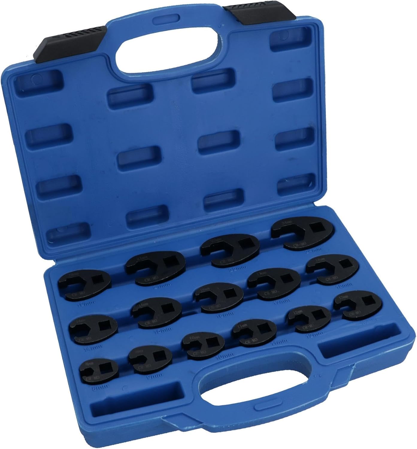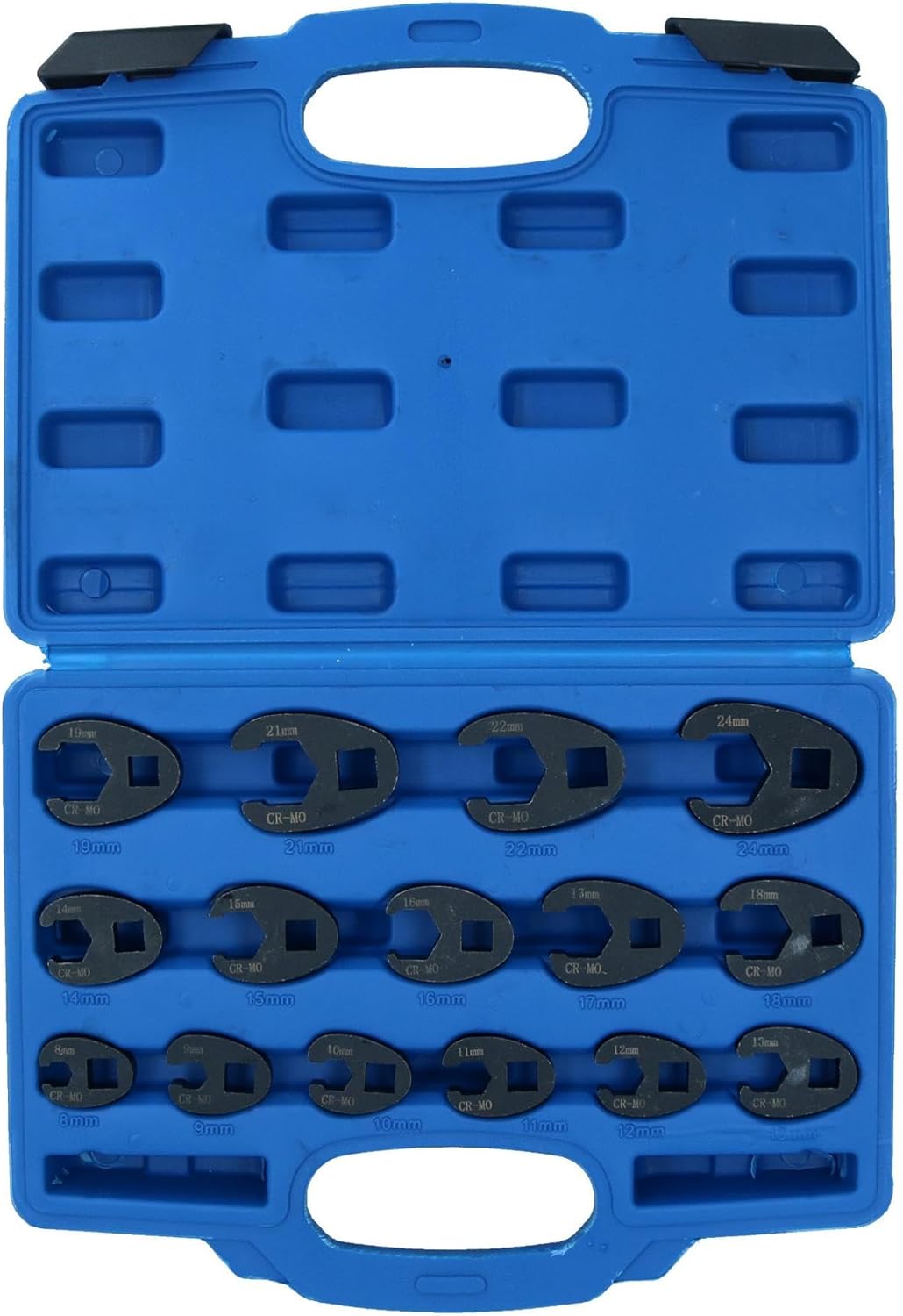 Professional crowfeet wrench for commercial or occasional use Impact metric crowfeet set Mixed drive (3/8in. and 1/2in) crowfeet spanners Metric crowfeet ranging from 8mm – 24mm Metric sized measurements Manufactured from CR-Mo steel for maximum strength Impacted crowfeet so ideal for use with high torque tools for added strength and durability Suitable for a wide range of uses including for brake pipes, hydraulic pipes or on long threaded bars where you can’t get a spanner Ideal for use where access is limited 3/8in and 1/2in drive crowfeet spanners / wrenches Never be stuck again in a tight unreachable place SET INCLUDES THE FOLLOWING SIZES 3/8in Drive Crowfeet – 8mm, 9mm, 10mm, 11mm, 12mm, 13mm, 14mm, 15mm, 16mm 17mm, 18mm and 19mm 1/2in. Drive Crowfeet – 21mm, 22mm and 24mm Comes in a blow molded case with carry handle and lock for easy storage and transportation