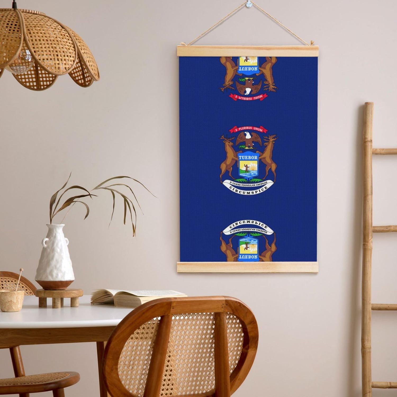 Our Michigan State Flag Print Wooden Poster Hanger Is An Excellent Addition To Your Home Decor Or A Perfect Gift For Friends And Family. Made Of Selected Quality Canvas With Brilliant And Enduring Colors, This Wall Art Is Designed To Resist Water, Dust, And Fading, Ensuring The Bright And Vibrant Art Lasts. The Polyester Is Enclosed Between Two Teak Wood Hanger Scrolls With An Attached 35cm Rope For Easy Hanging. Installation Is Made Simple With The Included Two Nails In A Plastic Box. The Modern Minimalist Style Of Our Wall Hanging Complements Any Home Decor, Elevating The Artistic Ambiance And Brightening Up The Room. Experience The Elegant Transformation This Wall Hanging Scroll Painting Brings To Your Spaces Today.