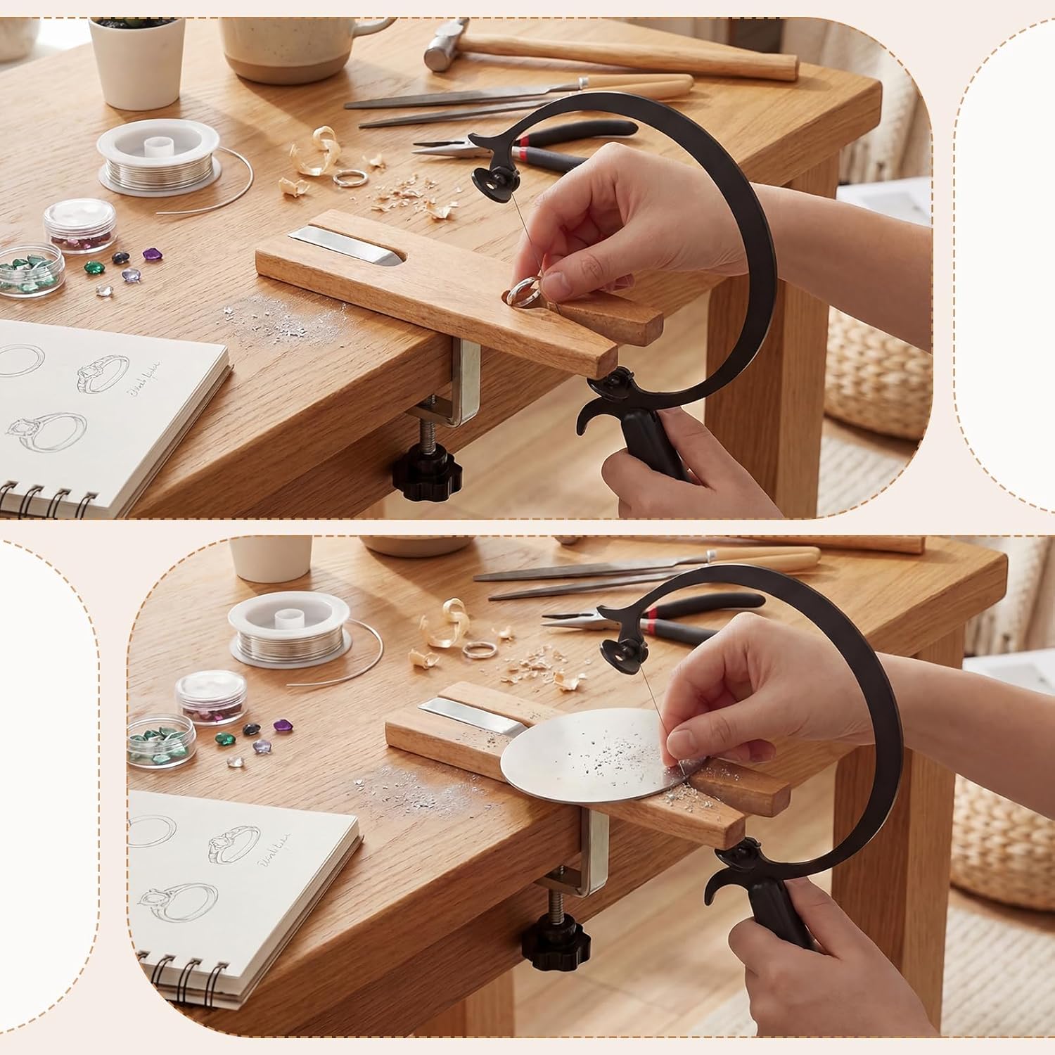 Features: Ergonomically designed: Featuring a curved jeweler's frame making kit, this jeweler's saw set boasts a black and silver ergonomic handle designed to minimize effort and maximize control, making it an ideal choice among jewelers tools. Comprehensive kit for enthusiasts: This complete jeweler's saw set is an indispensable companion for you passionate about creating or refining jewelry. It is optimally designed to satisfy the precise demands of both emerging artists and skilled craftsmen. Specifications: Material: plastic, metal Color: black, silver Size: Saw blades: about 11.22 x 6.3 inches/ 28.5 x 16 cm Bench pin: about 7.48 x 2.32 inches/ 19 x 5.9 cm Package includes: 144 x Saw blades 1 x Bench pin 1 x Bench Pin 1 x Clamp Versatile Tools Notes: Manual measurement, please allow slight errors on size. The color may exist a slight difference due to different screen displays Pointed items are included, please be careful when using and please keep them away from kids. If you use our products with your own necklace or pendant, please check whether the product is in good condition before use to avoid unnecessary loss of personal property. Small parts included, please keep them away from little kids to avoid swallowing risk