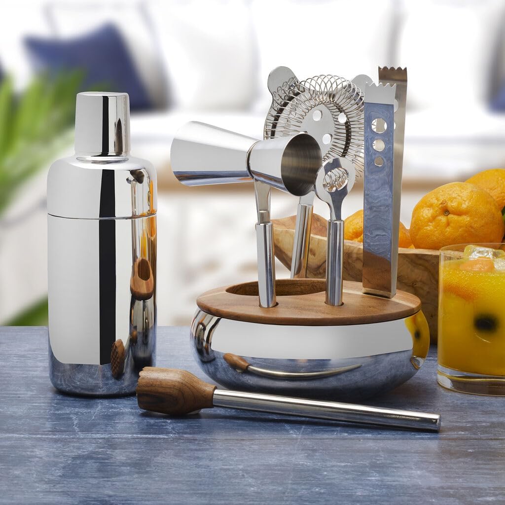 Elevate your home bar to new heights with our Classic Bar Tool Set; a harmonious fusion of sleek stainless steel and natural acacia wood accents. Designed to impress even the most discerning cocktail connoisseurs, this set provides everything you need to craft and serve your favorite libations with style and sophistication. Crafted from high-grade stainless steel, our bar tools are weighty and built to last. Set includes a 530ml cocktail shaker, double jigger, strainer, muddler, ice tongs, and a bottle opener. Keep your bar tools neatly organized and readily accessible with the included wood-accented stand which not only adds a touch of sophistication to your bar area but also ensures that your tools are always within arm's reach. Bonus Nut Bowl; easily lift up the stand to use the base as a beautiful and functional nut or snack serving bowl. All pieces are dishwasher safe except for the stand which can be wiped clean with a damp cloth.