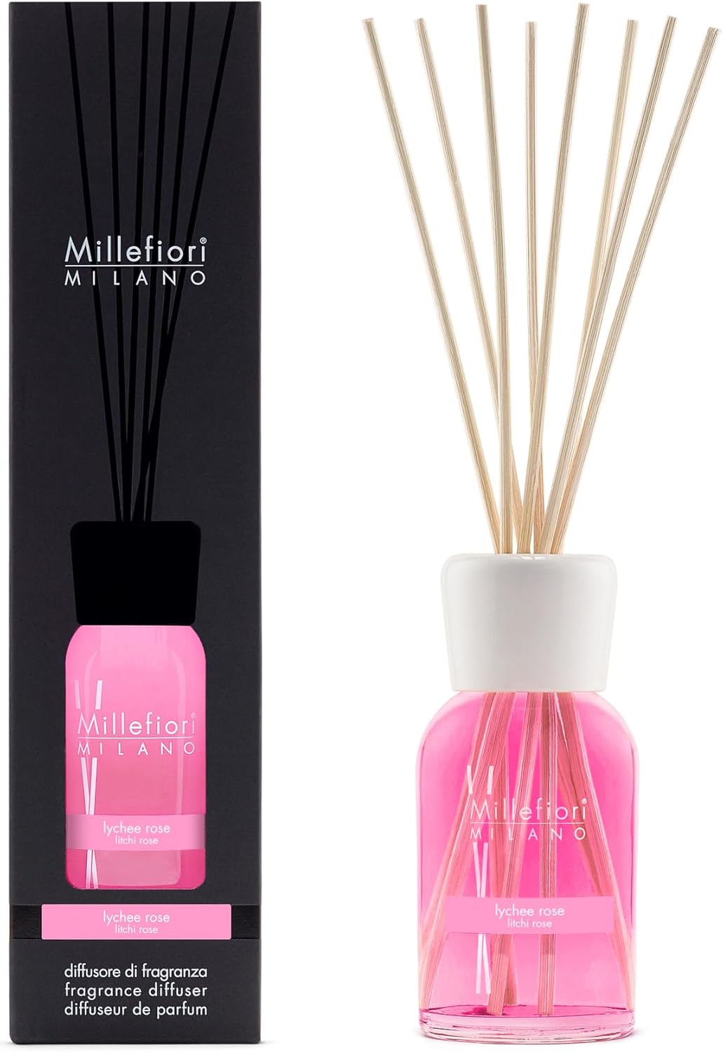 For an elegant and pleasant fragrance diffusion. This fragrant fragrance diffuser is part of the Millefiori Milano collection, in which colour and brightness blend to create a personal atmosphere in any environment. Fragrance any room with a vibrant fragrance and add a modern touch to your décor. Ideal for indoor spaces and for an elegant and pleasant fragrance diffusion. The Millefiori Milano fragrance diffuser is a stylish statement in your home. FRAGRANCE DESCRIPTION: The inspiration of Damascus Rose, the most precious and fragrant of roses, is enhanced by the exoticism inspired by Timur pepper, a rare Nepalese spice that evokes the sweetness of ripe lychee. OLFACTORY FAMILY: Blooming Top Notes: Timur Pepper, Lychee Heart Notes: Damascus Rose, Geranium Base Notes: Musk, Cedar Wood